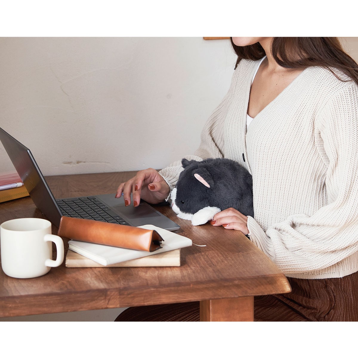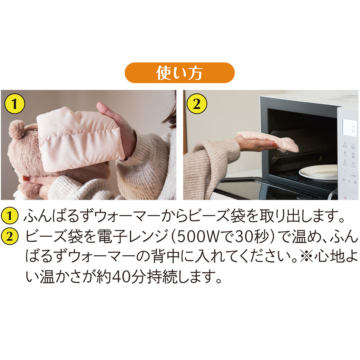 電子レンジで繰り返し温められるビーズ袋入り。じんわり温めてくれるだけでなく、机とおなかの間にしっかり挟み込むと自然に良い姿勢に。