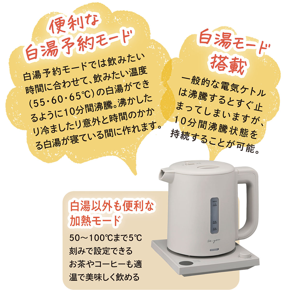 一般的な電気ケトルは沸騰するとすぐ止まってしまいますが、10分間沸騰状態を持続することが可能な白湯モード搭載。