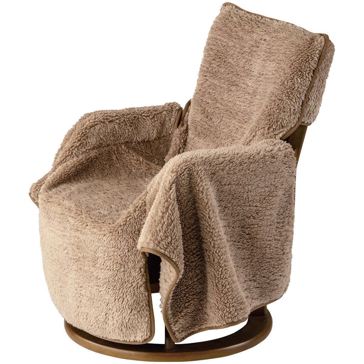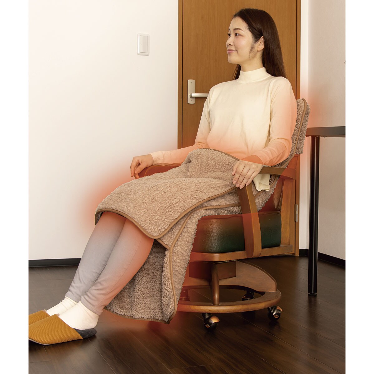 イスに座って左右手すり部分のカバーを自分に巻きつければ、腰がぐるっとあたたかい♪〇長い毛足がしっかりと空気を溜め込んで、あたたかさを保ちます。〇背もたれに被せればOK!