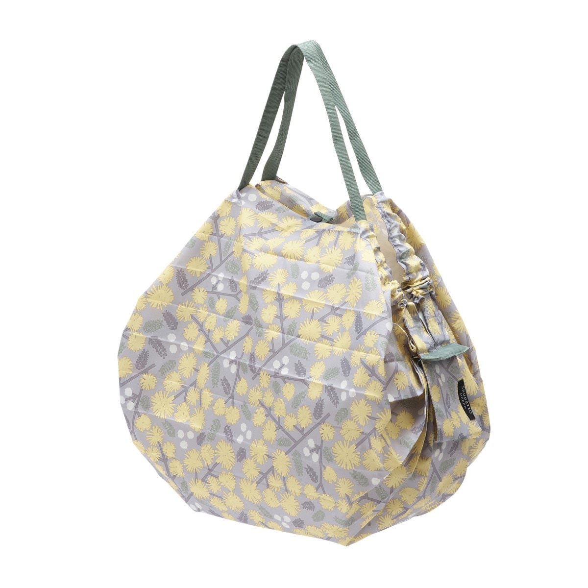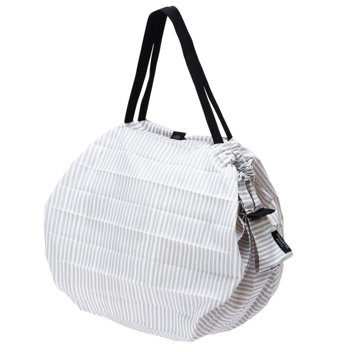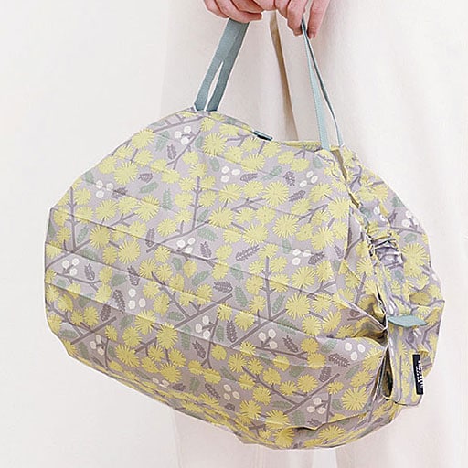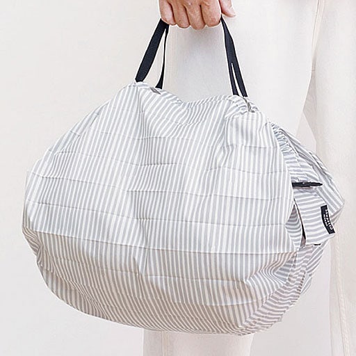 両端を引っぱると一気に帯状に。あとは2回半分に折って丸めるだけでたためます。毎日のお買い物や、荷物が増えたときのサブバッグにおすすめです。底マチフリー構造のため、底面が広いお弁当やケーキの箱も入れられます。丸めた後も持ち運びやすいコンパクトサイズです。