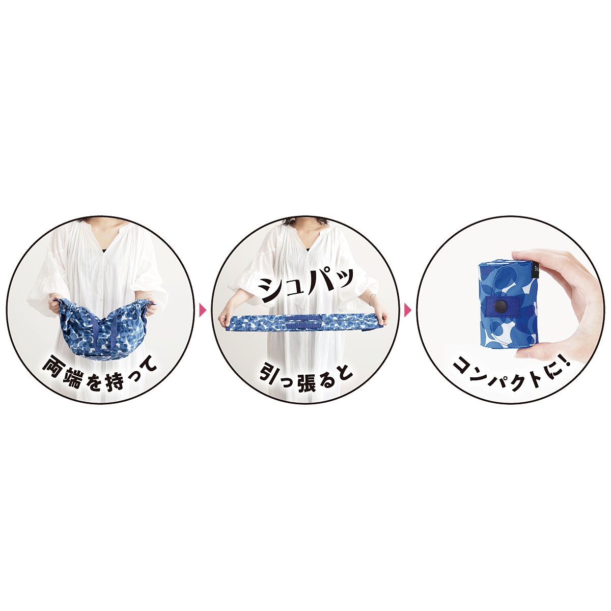 両端を引っ張るだけで一気にたためる便利なエコバッグ
