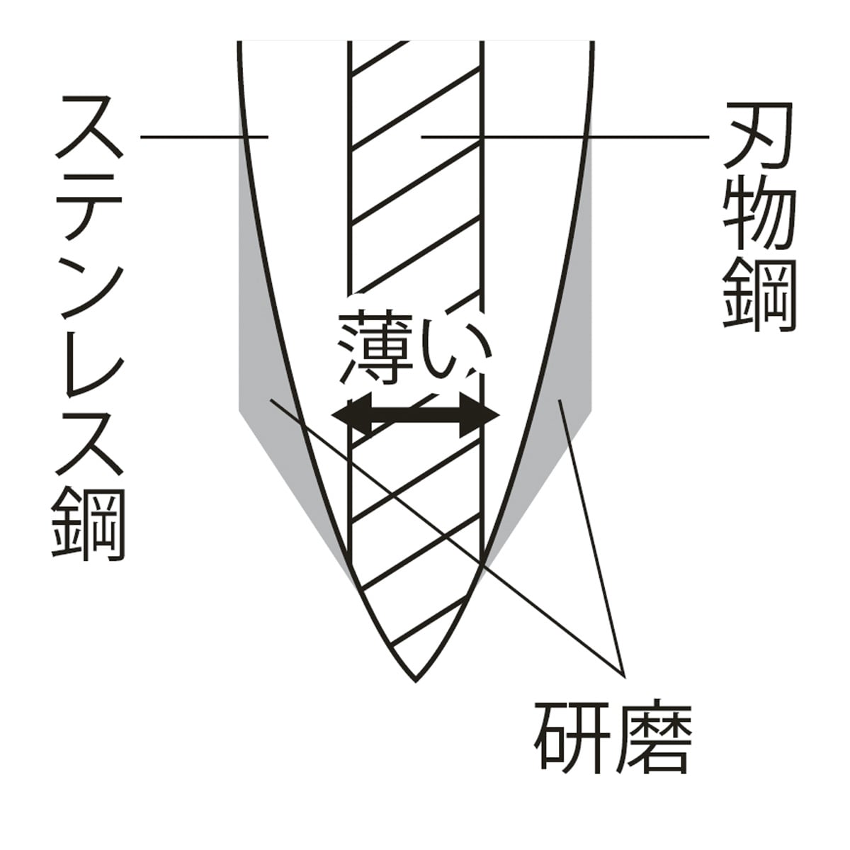 切れ味のよい刃物鋼と研ぎやすくサビにくいステンレス鋼を使用。
