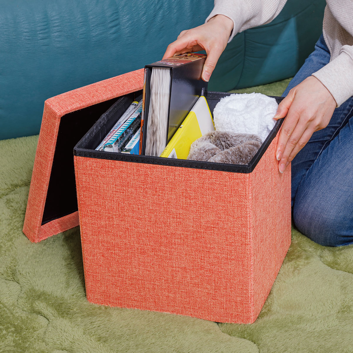 使わないときはたためてコンパクトになるスツールです。オットマンやおもちゃの収納にも。