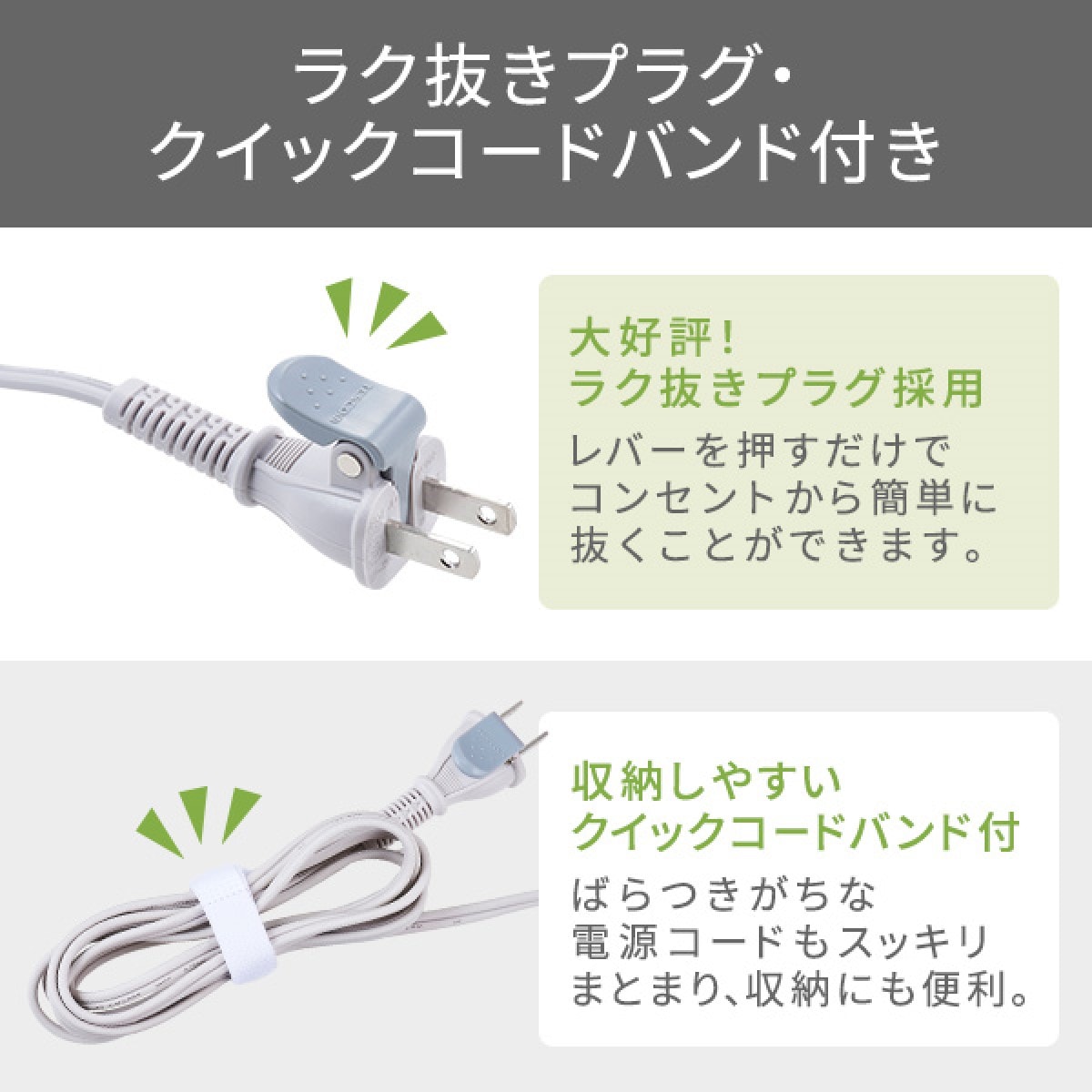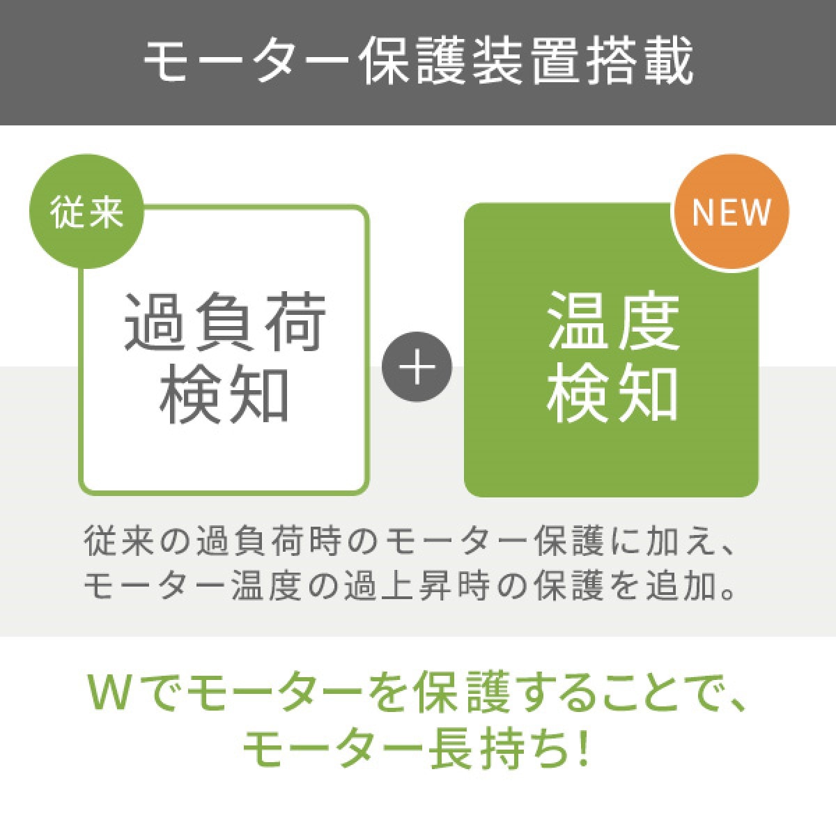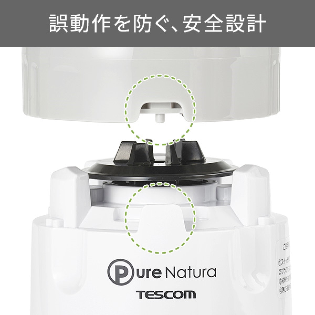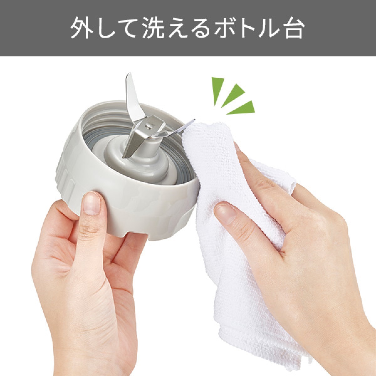 かさばる葉物もたっぷり入る大容量1000mLボトルのミキサー。清潔でお手入れも簡単なガラス製です(耐熱ガラスではありません)。氷も細かく砕ける大型刃(※1)で、冷凍庫の角氷をそのまま砕いてクラッシュアイスにできます。(※1:氷は家庭用製氷皿で作った氷(約2.5cm角以下)を使ってください)ミキサーとボトル台が外せる洗いやすい構造に加え、コンパクトにしまえる逆さボトル収納やクイックコードバンド付きで収納もラクラク。 ミキサーボトルをボトル台と本体に取りつけないと動作しない安全設計で、誤作動を防ぎます。