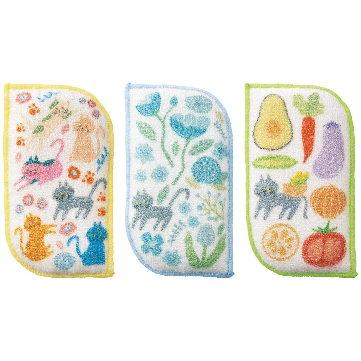 【セシールオリジナルキャラクター】北欧(ノルディック)風にゃんこたちの便利でかわいいアイテム♪洗い物が楽しくなる! キッチンスポンジ3個組。表と裏で素材が違うので用途によって使い分けできます。