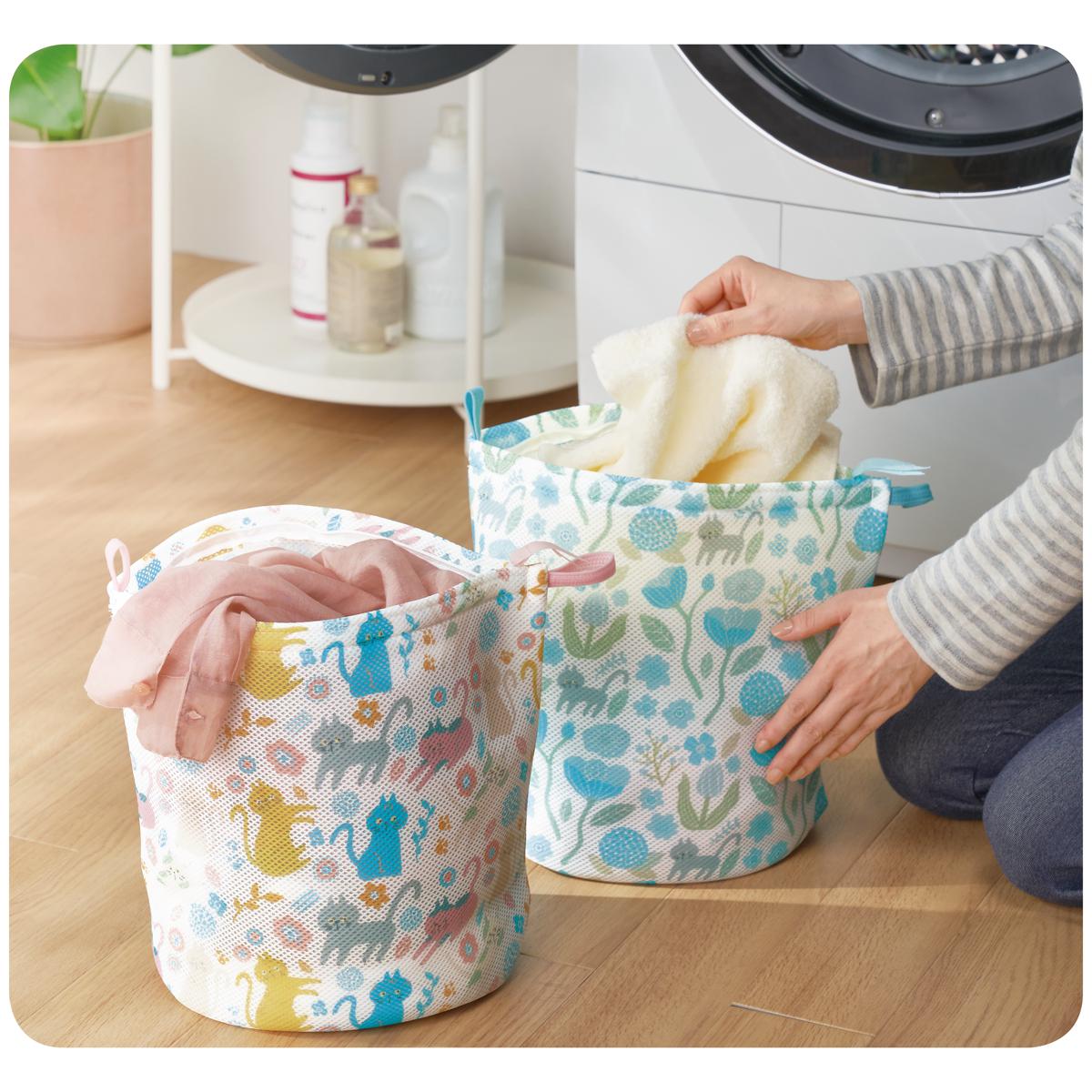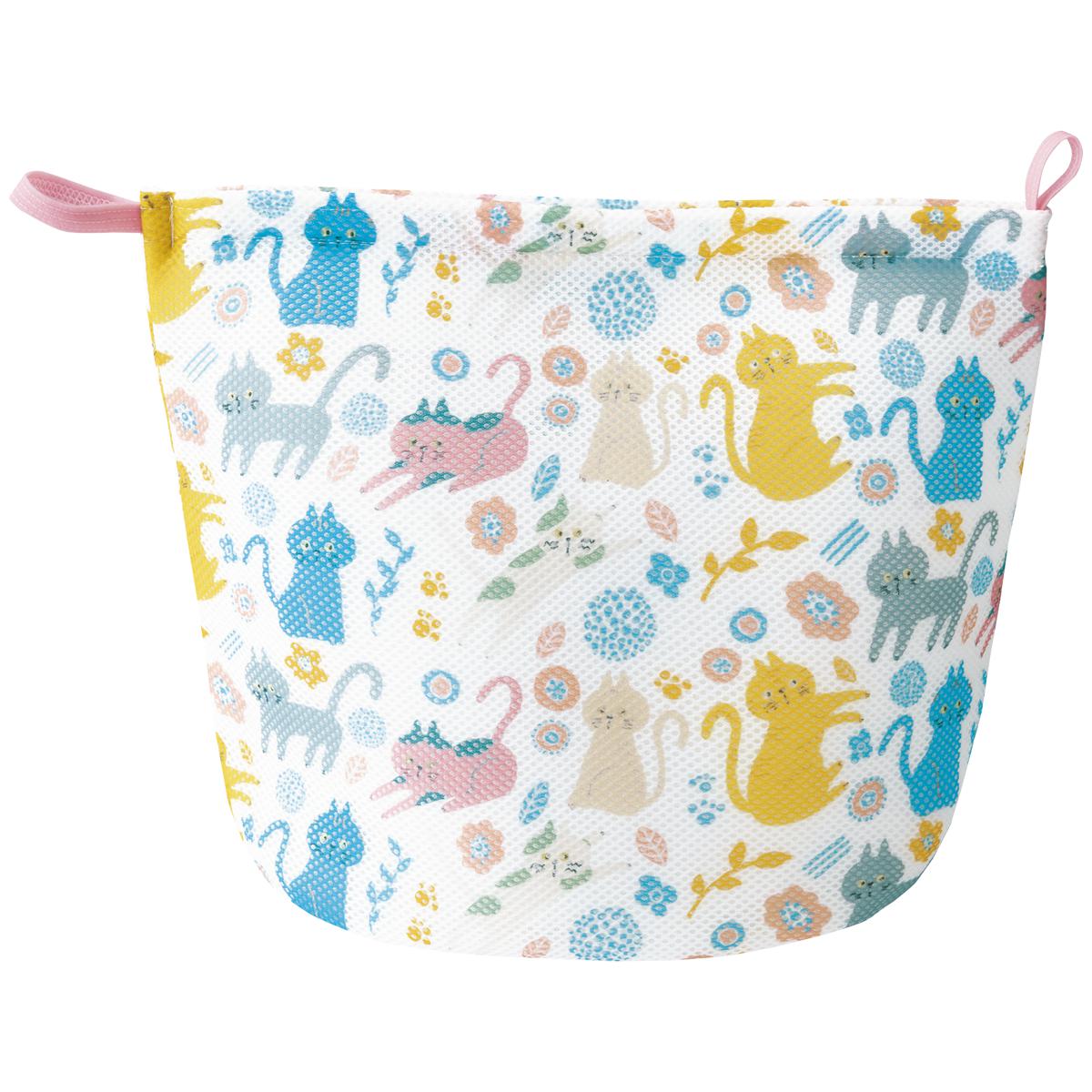 【セシールオリジナルキャラクター】北欧(ノルディック)風にゃんこたちの便利でかわいいアイテム♪衣類を保護しながらやさしく洗える、クッションメッシュ素材のランドリーネットです。自立するので洗濯物をそのままポンと入れられます。