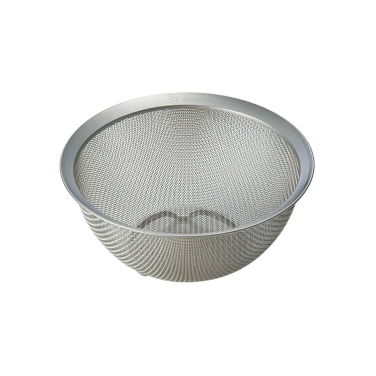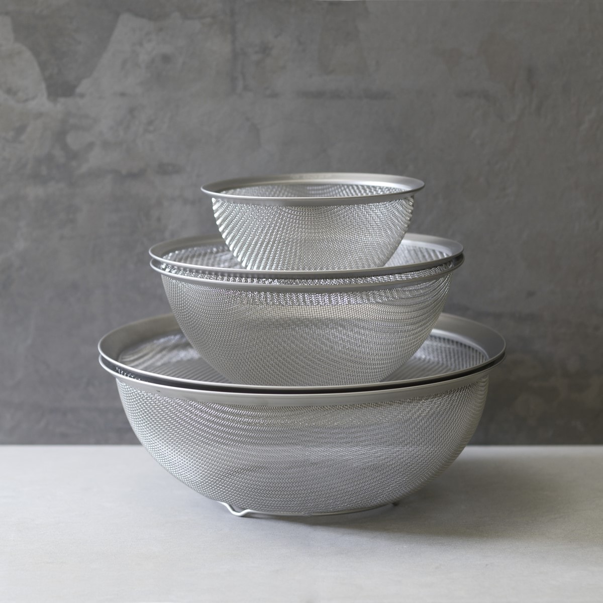 綾織を採用。縦線横線が互いに二本ずつ乗り越して上下に交差した織り方です。平織りでは使用する事のできない太い線材を用いる事ができ、強度が優れています。使いやすく足つきなので、水切りがよく清潔です。より早くスムーズに水切りしたいときに、ボウルの縁に足を引っ掛けて傾斜をつける、という使い方もできます。大(27cm)、中(21cm)、小(15cm)の3サイズ。深さがあるので、それぞれ十分な容量があります。同サイズのボウル(WF-6916)と組み合わせて使用でき、重ねて収納できます。