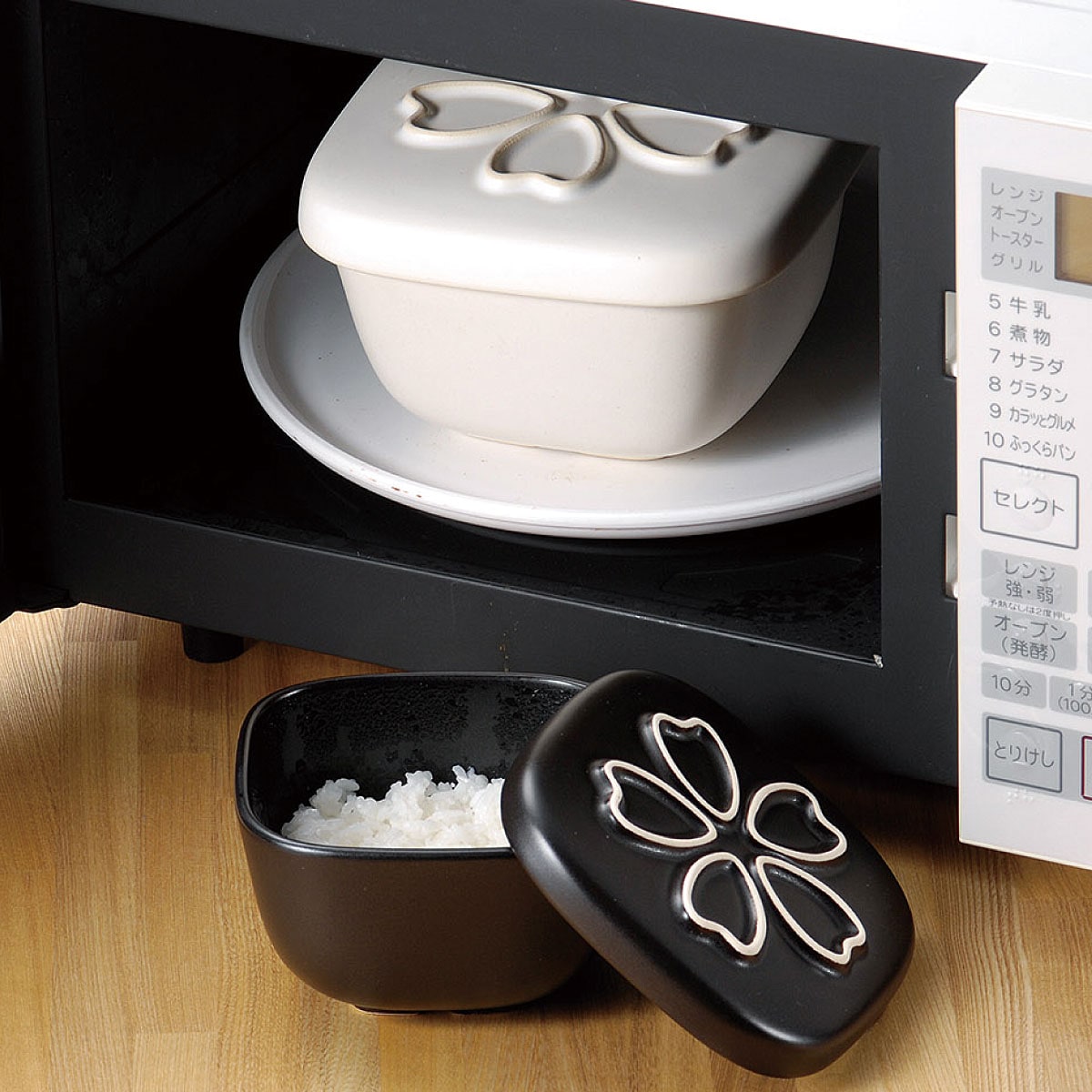 陶器ならではの細かい空気孔が余分な水分を吸収するため、プラスチック容器と比較してべたべたせず、電子レンジでそのまま加熱できます。加熱時に吸収した水分を放出するので、翌日でもふっくらつやつやしたご飯になります。角型なので冷蔵庫にも収納しやすい。1合2合の便利な2サイズ。蓋はかわいい桜模様です。