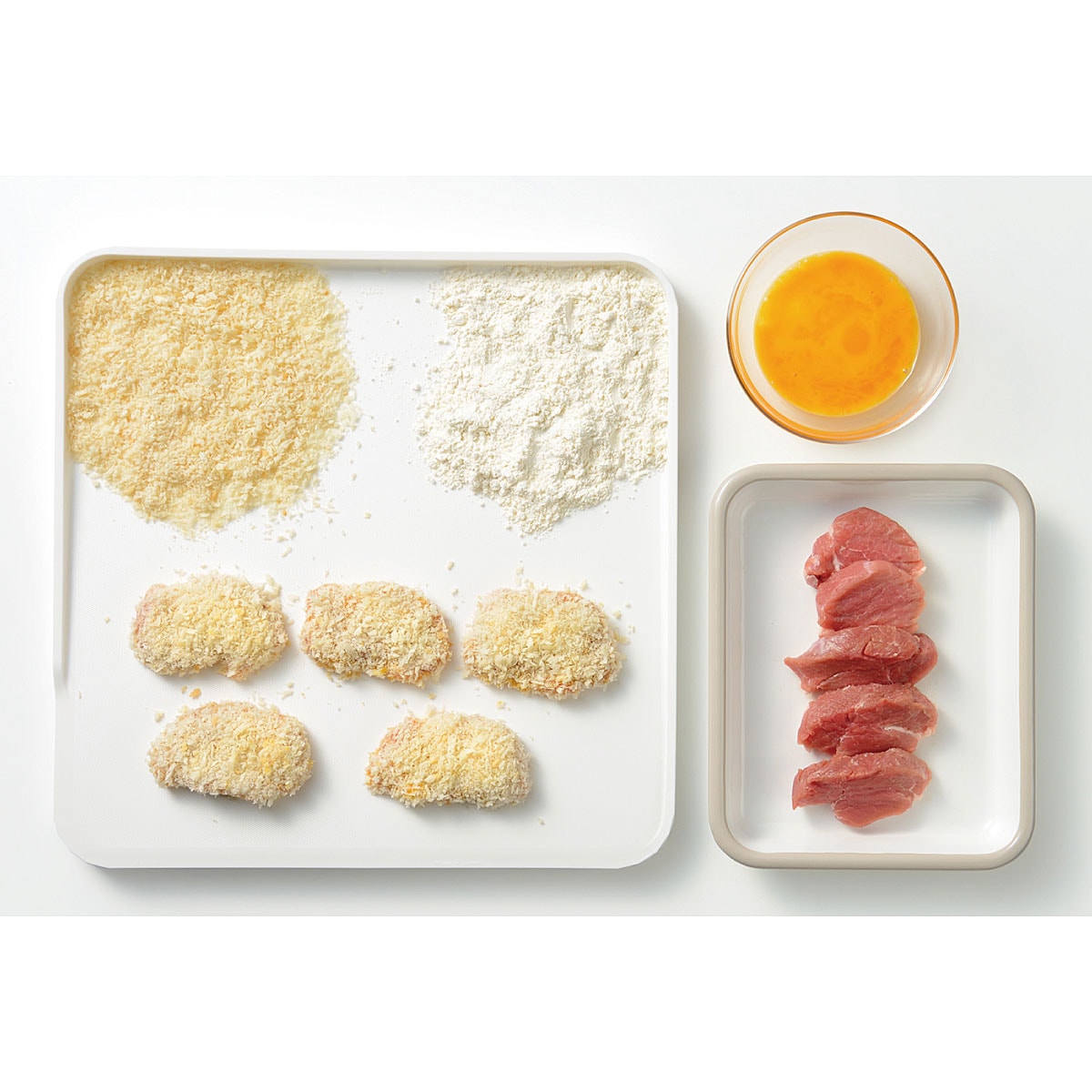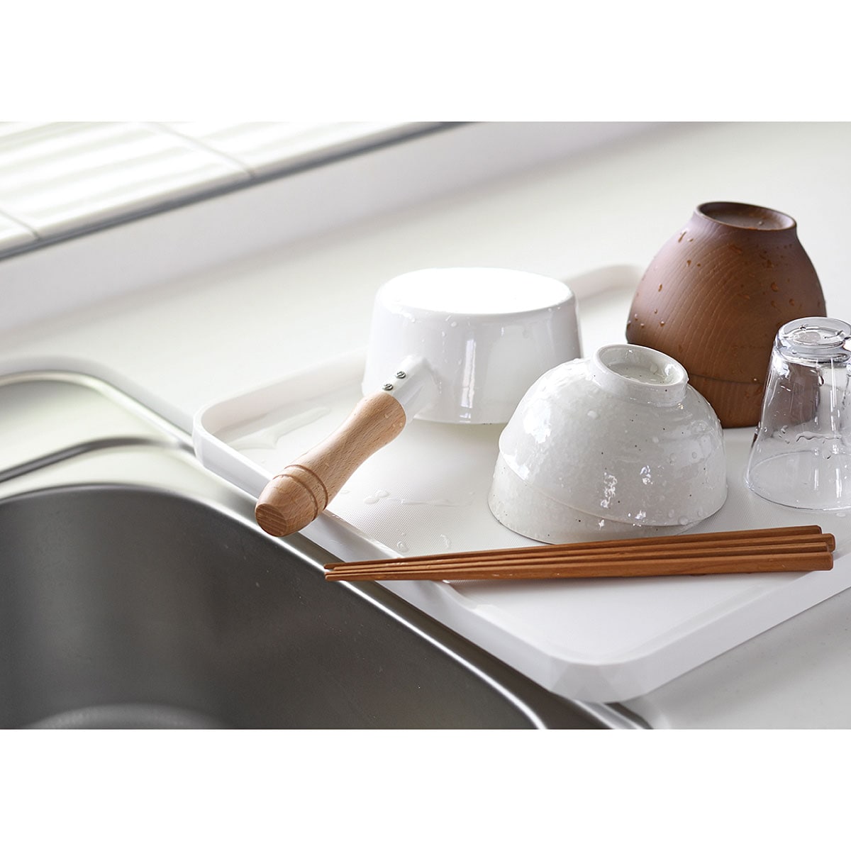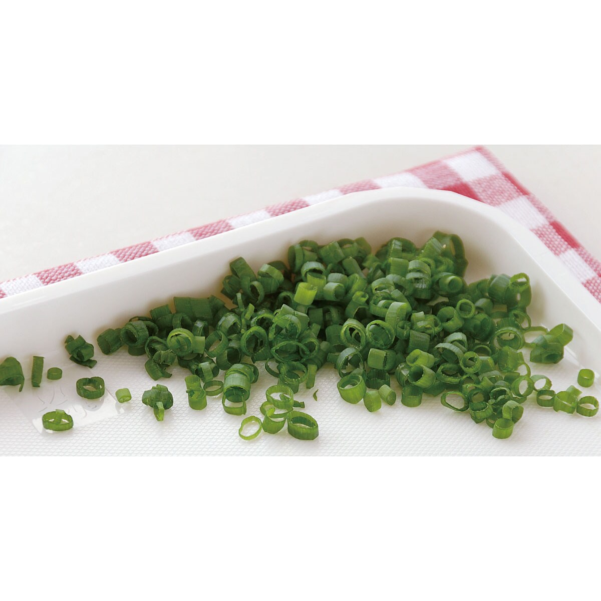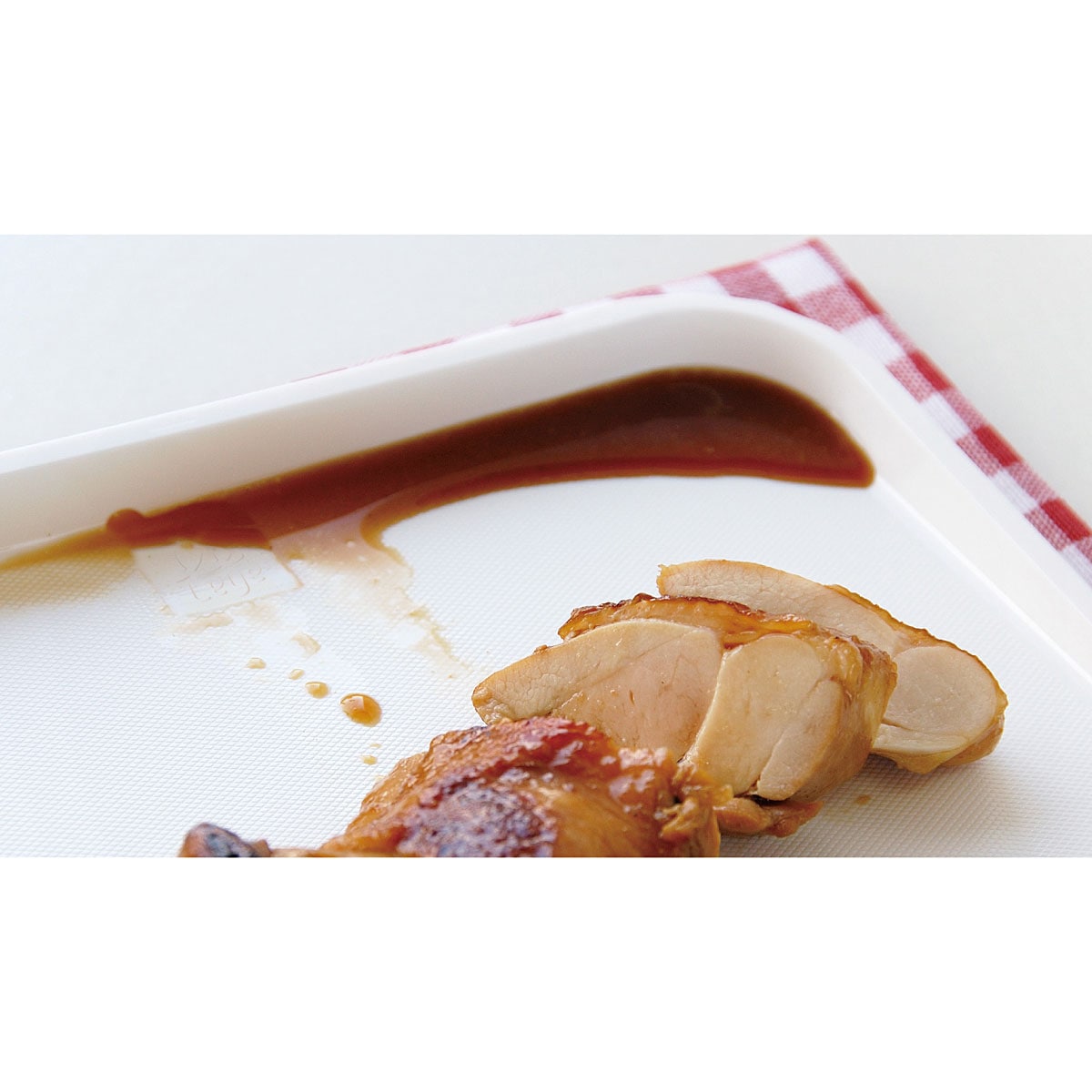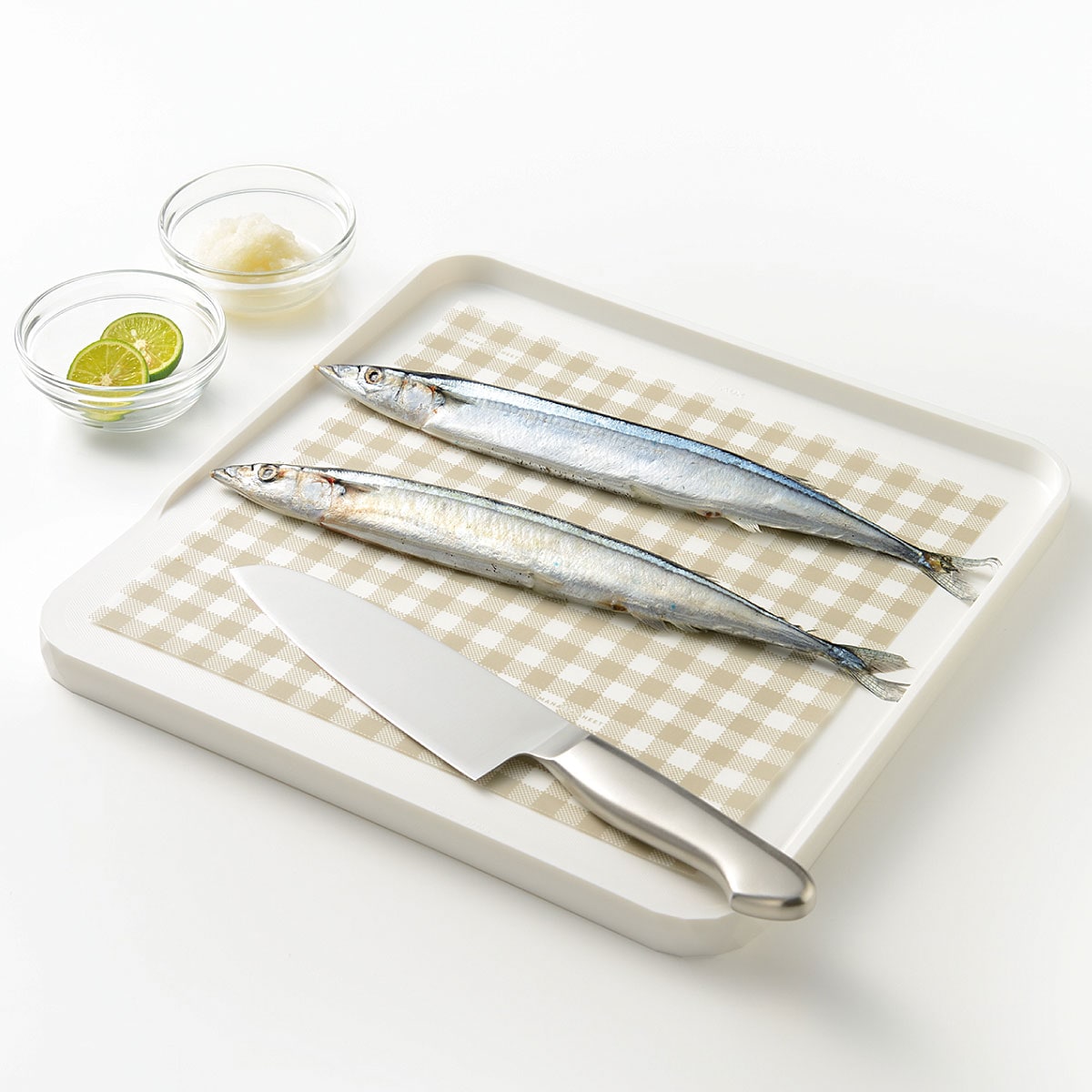 奥に向かって、ゆるい傾斜が付いており、フチがあるので、切った食材や水分がこぼれにくい仕様です。奥行が広いので、手前で食材を切りながら、切った食材を奥に寄せれば続けて作業できます。揚げ物をするときのバット代わりやちょっとした水切りにも。裏面は浮いているので清潔。裏返して、お肉と野菜など使い分けできます。まな板の大きさに合わせたまな板シート(29cmx29cm)が5枚付いています。