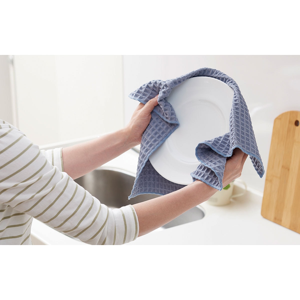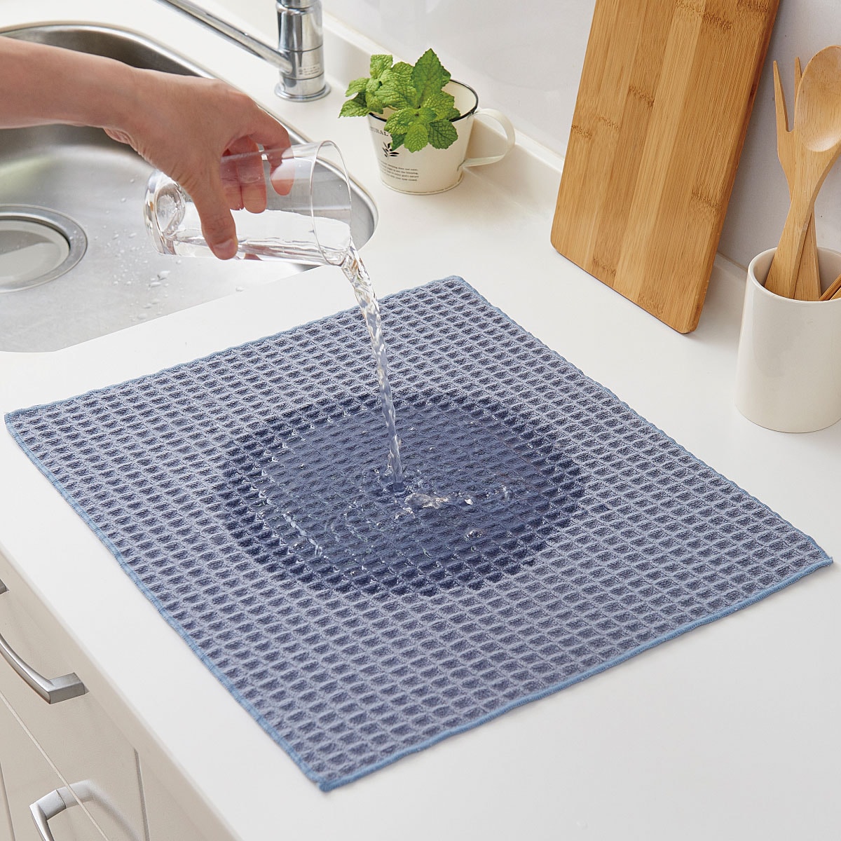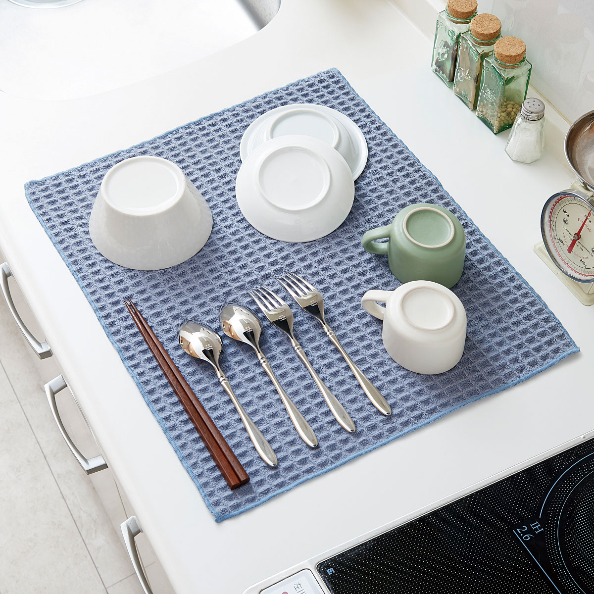 水切りマットの他にも、食器拭きやテーブルふきんとして使える優れモノ!ワッフル素材のマイクロファイバーなのでやわらかく、速乾性にも優れています。うれしい抗菌機能つき。