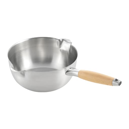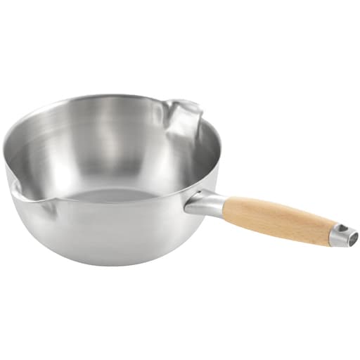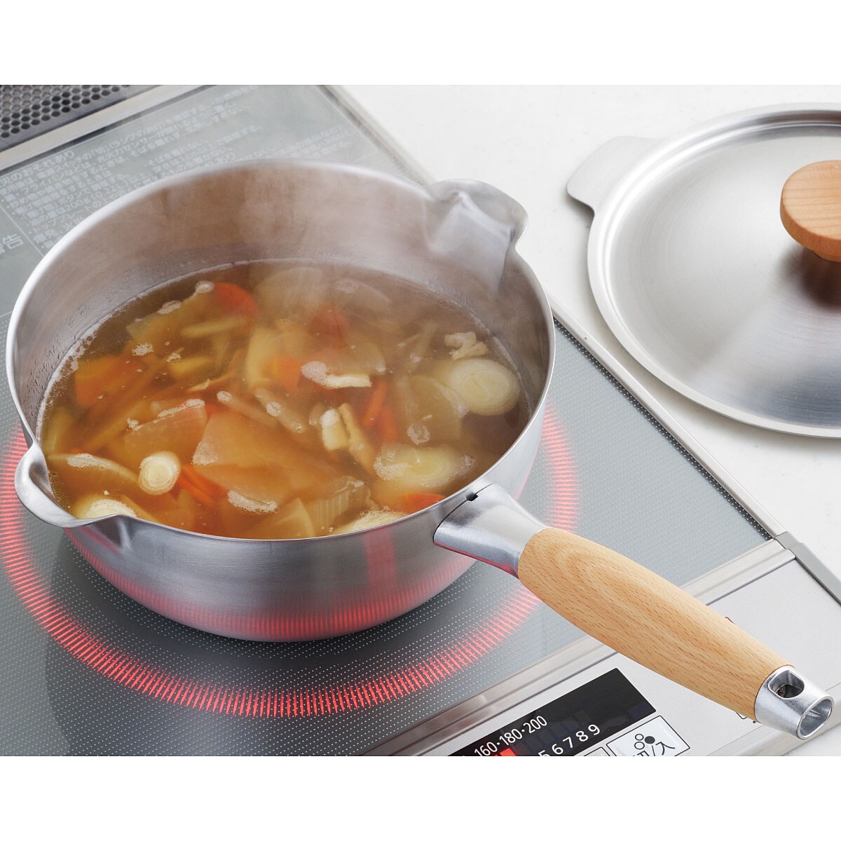 特許取得済の自慢の口形状!汁物、煮物の移し替えやスープジャーに直接注いでも液だれしないのでとても便利です。本体は、ほどよい丸みをつけた形状で、煮物を対流させておいしさを引き出せるよう工夫されています。ステンレスなのでお手入れもしやすく丈夫。○両口なので左右兼用○ガスコンロ・IH兼用