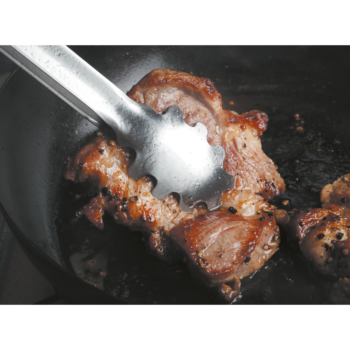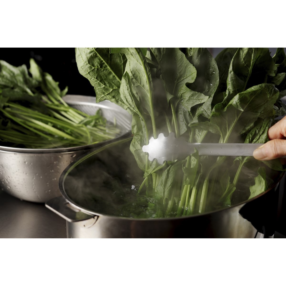 肉を焼く時や葉物野菜を茹でる時など調理シーンに欠かせないトング。しっかりと噛み合う先端部分、軽い力で確実に挟めるハンドルのバネ具合にこだわりました。ゆでたスパゲティの最後の一本までつかめます。「挟む」「つかむ」の他に「柔らかい物をふわっと優しく挟む」や「細かい物をつまむ」など菜箸で行うような作業もできます。つなぎめがないので、洗いやすく汚れがたまりません。