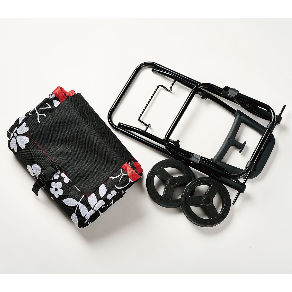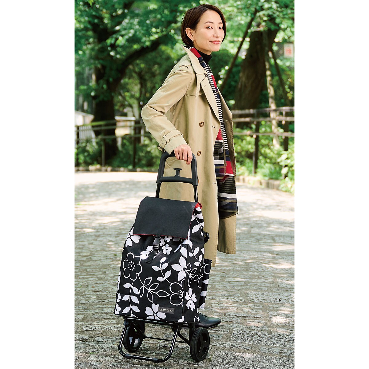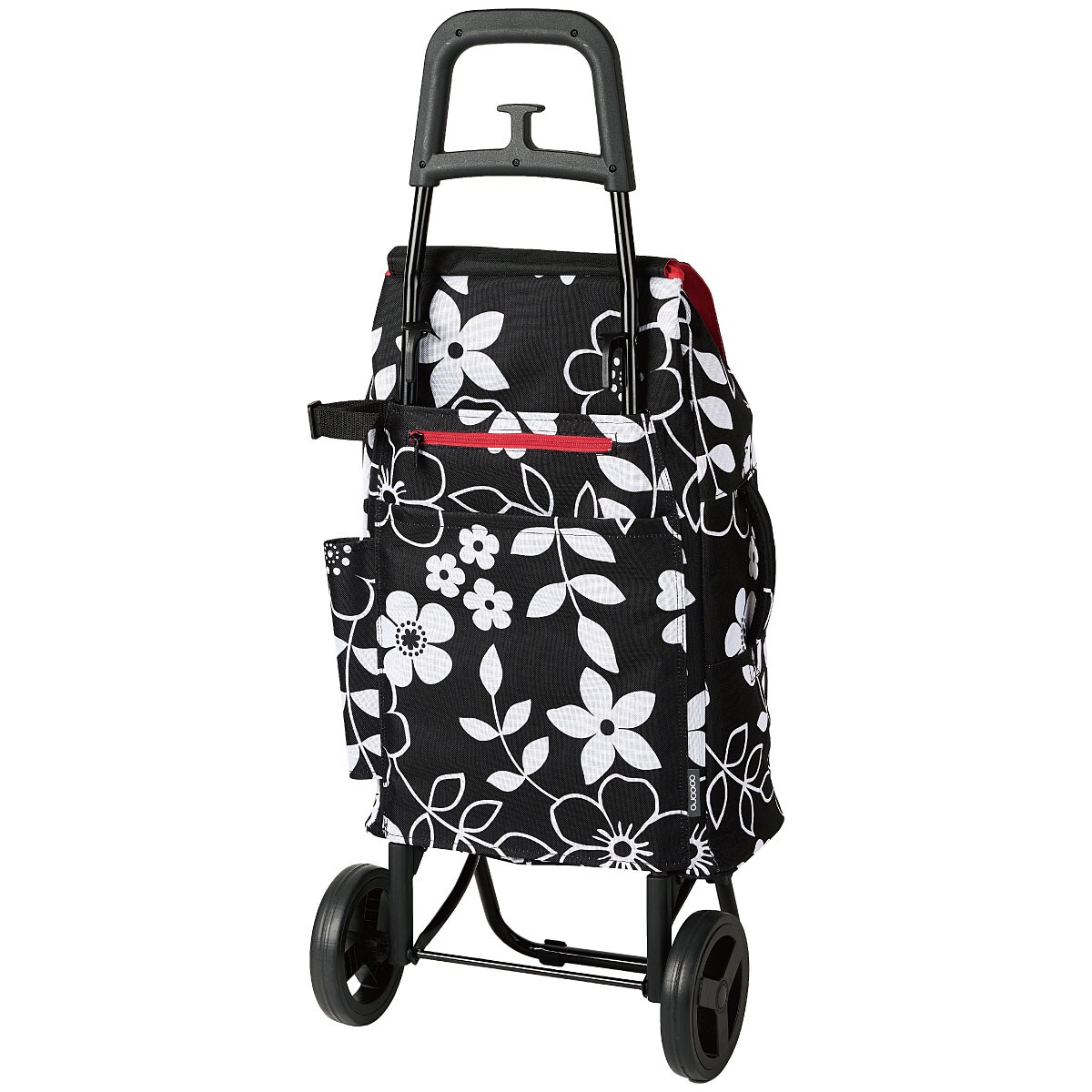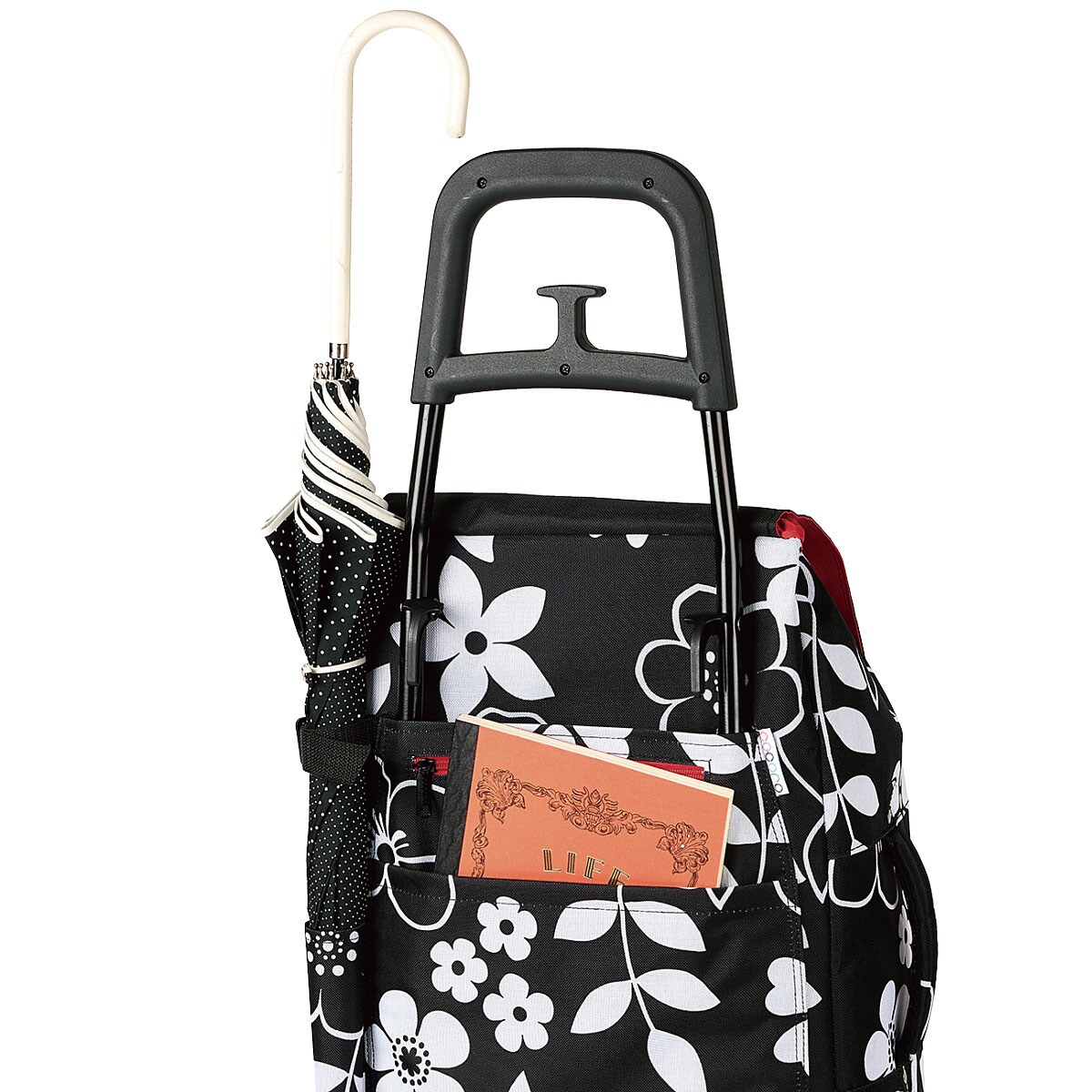 おしゃれなフラワー柄でカジュアルに持ち歩けるショッピングカート♪オープンポケット付きで折りたたみも可能、手持ちのバッグも引っ掛けられる等便利なカートです。レジカゴ約2杯分の大容量でお買い物もラクラク。●保冷保温ができるアルミシート●大型タイヤで安定した走行が可能。●お店のカートに引っ掛けられる※カートの状態によっては引っ掛けられないものもございます。