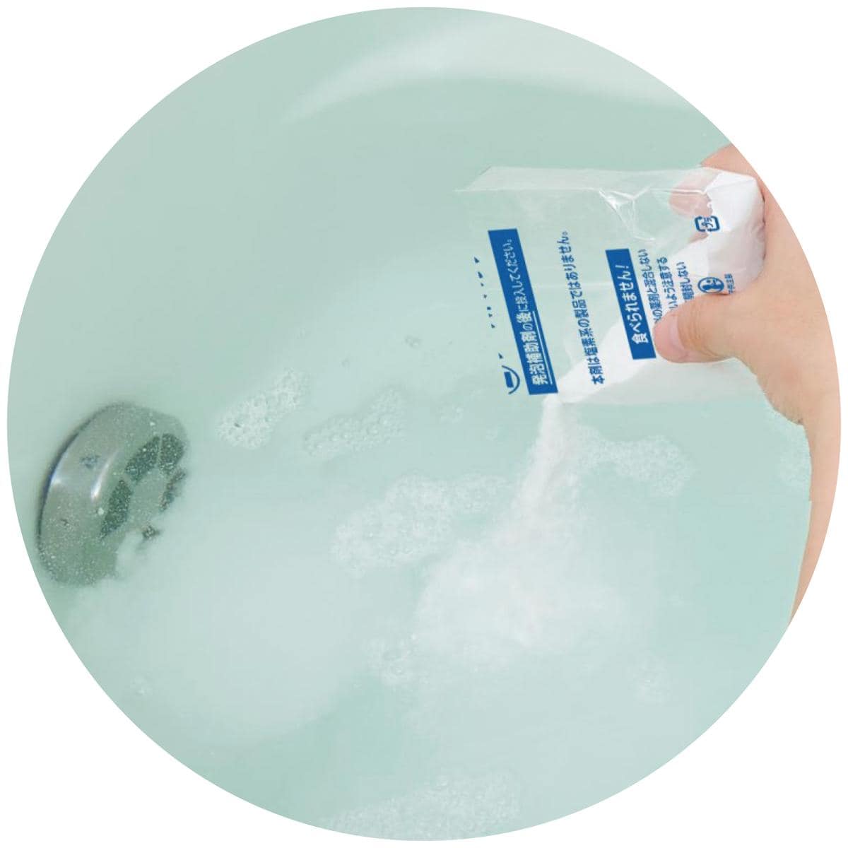 見えない配管の奥の汚れまでスッキリ強力洗浄!つけ置きタイプなので、追い焚き配管の洗浄と一緒に浴室小物の湯アカやヌメリもまとめて洗浄できます。