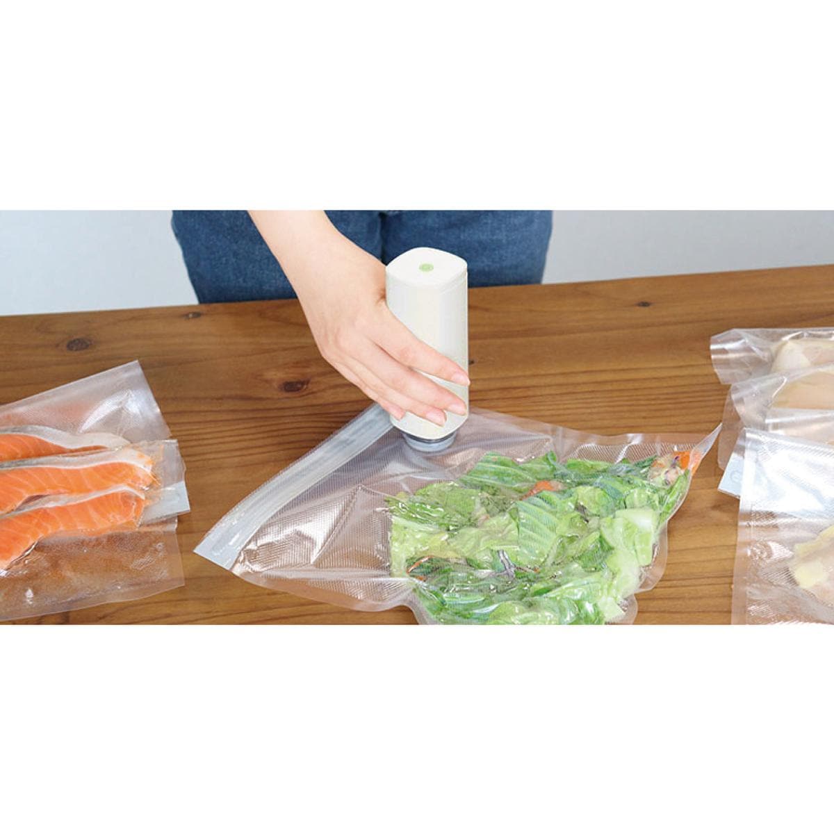 真空保存はメリットがいっぱい♪○食材が劣化しにくい○ニオイ移り防止○小分け保存引き出しや棚の隙間にも収納できるハンディタイプ。自動で吸引が止まるワンタッチの簡単操作。