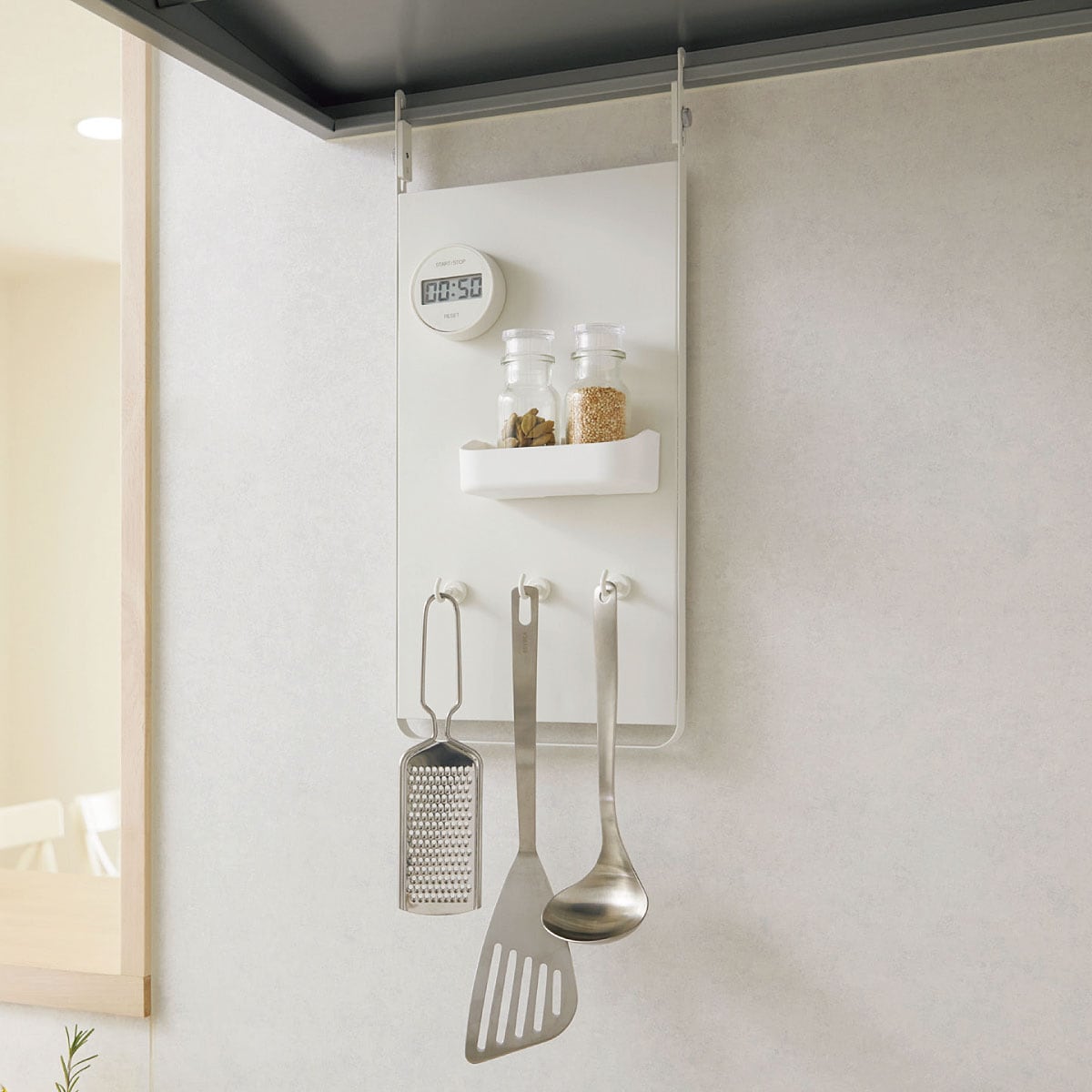 レンジフードに掛けるだけで収納場所がつくれるパネル。磁石がくっつくので、お手持ちのタイマーなどをつけても便利。