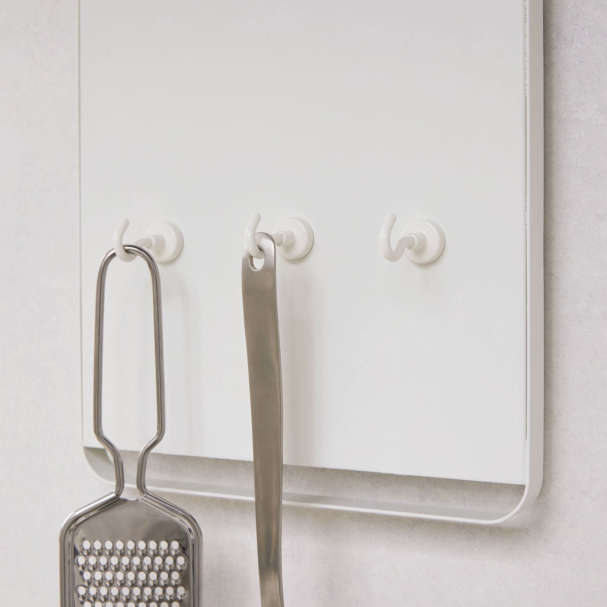 掛けて挟み込むだけの簡単設置。サイドにねじがついていて、回しやすい。マグネットが付いた小物などを、自由にパネルにつけて収納できます。(フック3個付き)