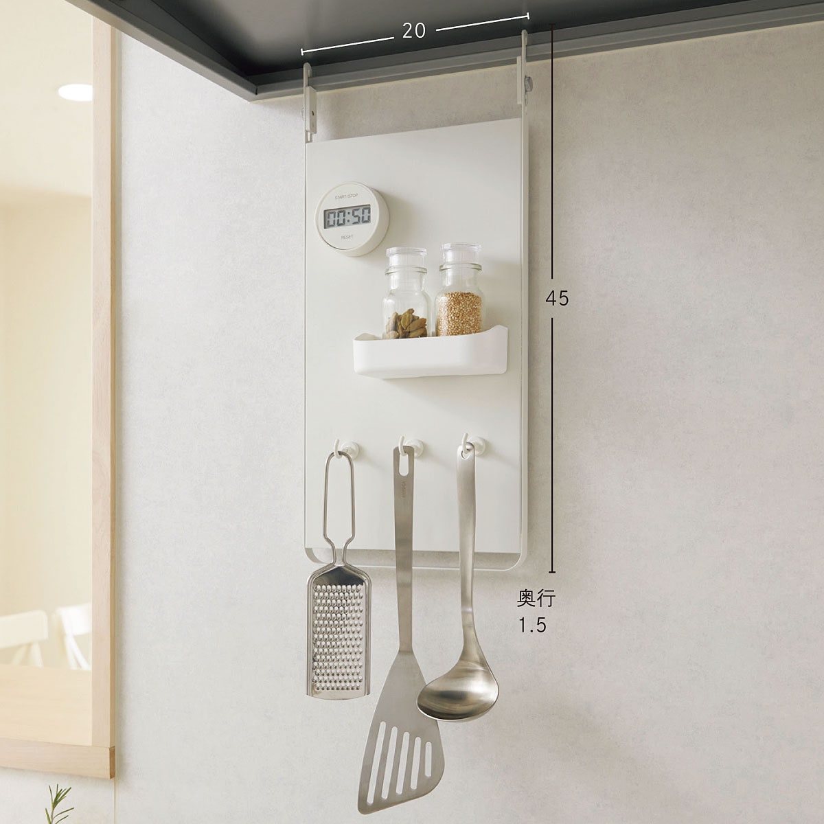 レンジフードに掛けるだけで収納場所がつくれるパネル。磁石がくっつくので、お手持ちのタイマーなどをつけても便利。 ※寸法の単位は約cmです。