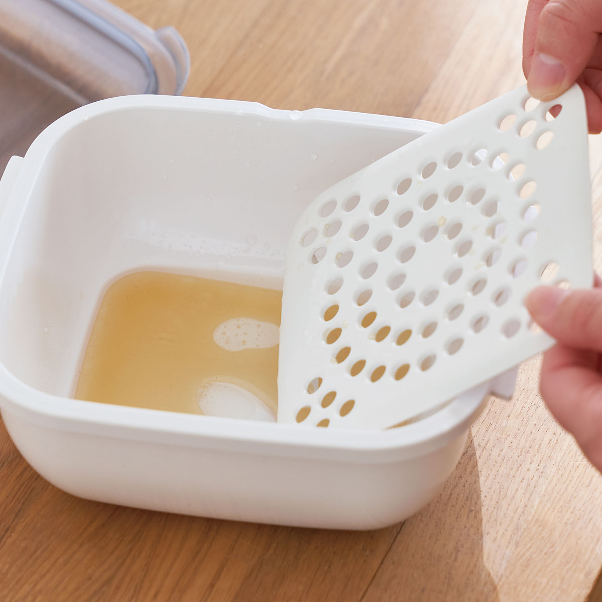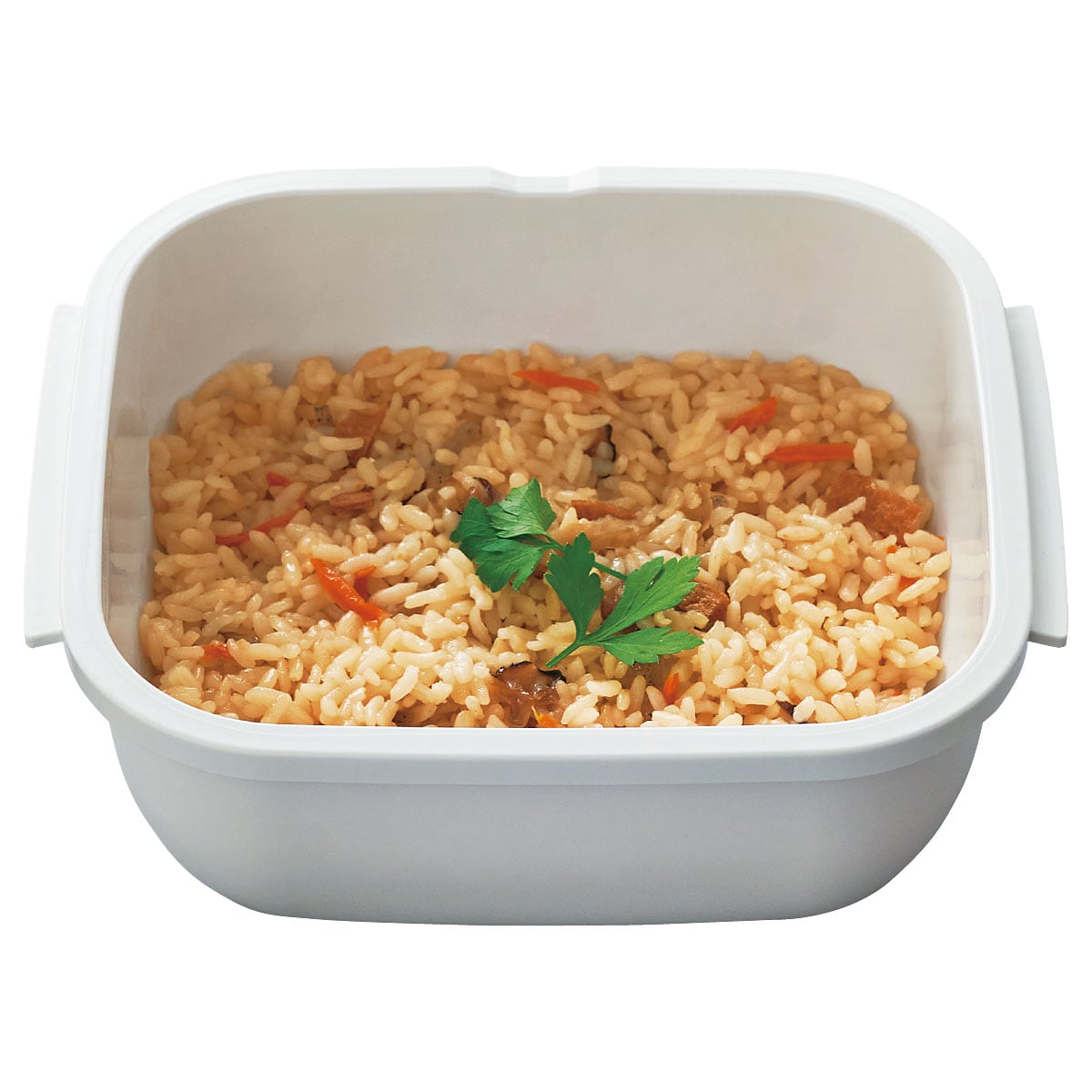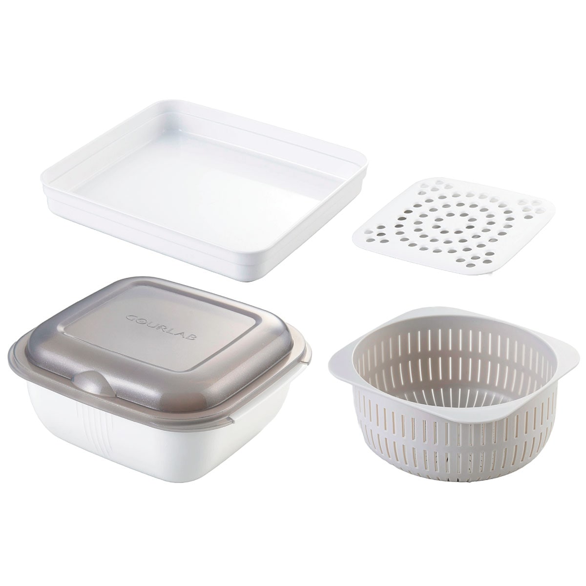 ■[本体・スクエアディッシュ・マルチプレート]スチロール樹脂 [フタ・コランダー]ポリプロピレン ■[サイズ(約cm)]本体(フタ含む)/18.8×16.7×8.9 コランダー/15.1×14.1×7.3 マルチプレート/13×12×1 スクエアディッシュ/19.9×18×3.2 ■[重量(約g)]本体(フタ含む)/161 コランダー/70 マルチプレート/22 スクエアディッシュ/118 ●耐熱温度/230℃(フタ・コランダーは150℃) ●耐冷温度/-40℃ ●対応可能熱源/電子レンジ、オーブン(フタ・コランダー不可) ※電子レンジ700Wまで対応 ▼オーブントースター・グリル機能不可●日本製