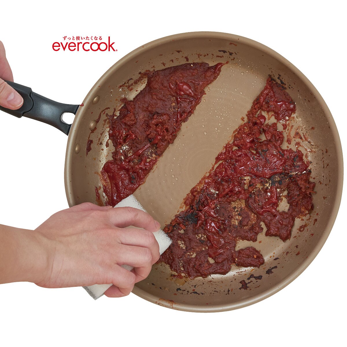 evercookは500日保証。フッ素の剥がれに対して、500日保証のついたフライパンです。フッ素コーティングをつかんで離さないアンカー構造とアルマイトコーティング。耐摩耗性試験50万回クリア。ツルすべだから汚れ落ちもスムーズ。「焼く」「蒸す」「煮る」1台でマルチに対応。
