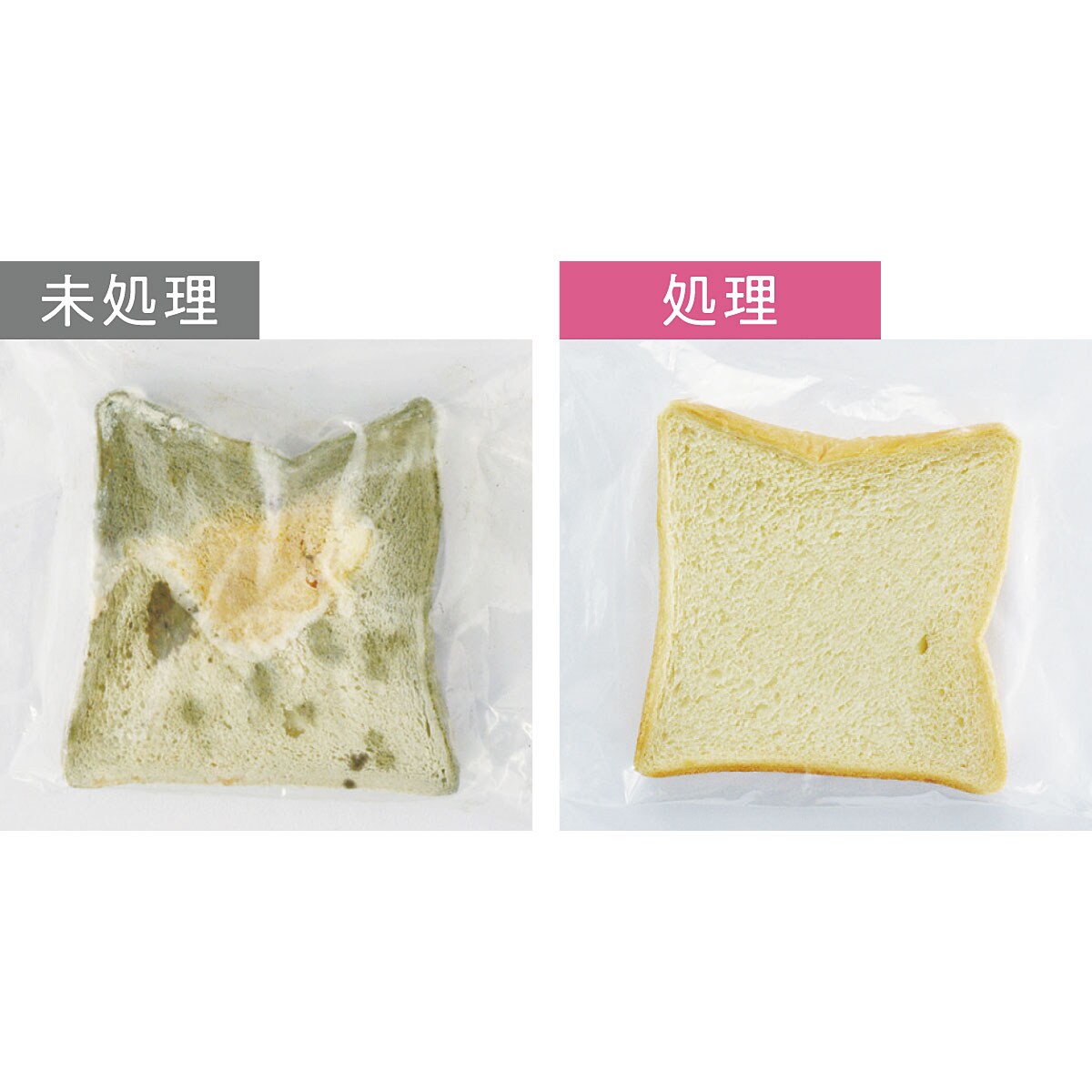 食パンを3カ月間放置して比較。処理済の方はカビの発生を抑制できています。※食品には使用できません。