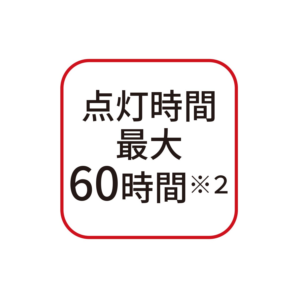 点灯時間最大60時間※2 ※2. 単3アルカリ乾電池使用時、ローモード時