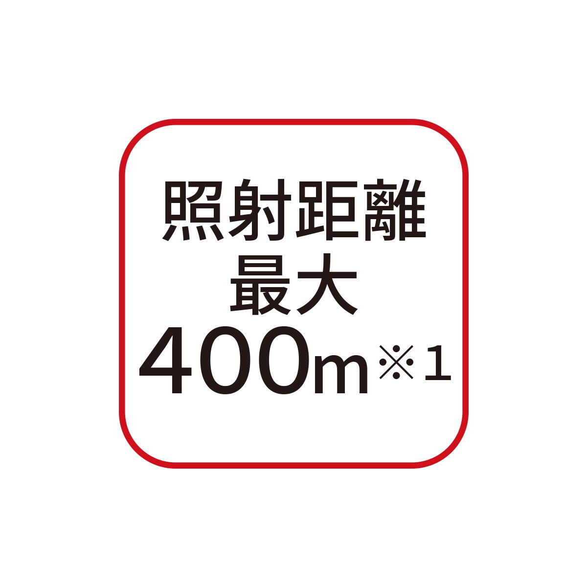 照射距離最大400m※1 ※1. リチウムイオン電池使用時、ハイモード時
