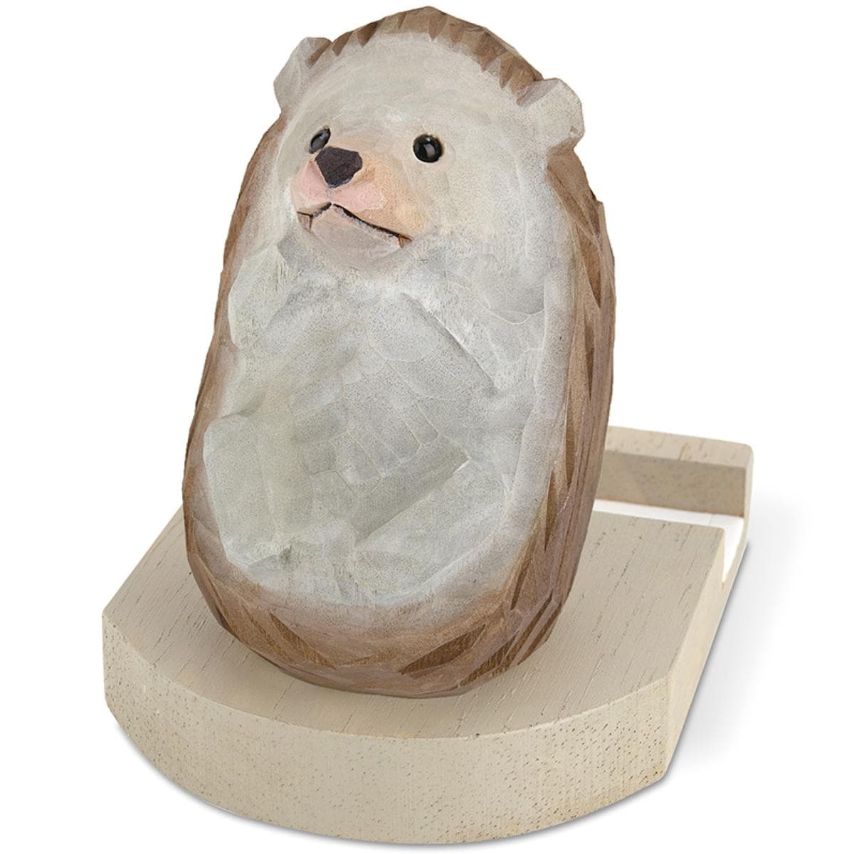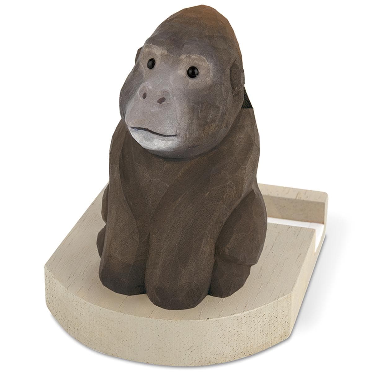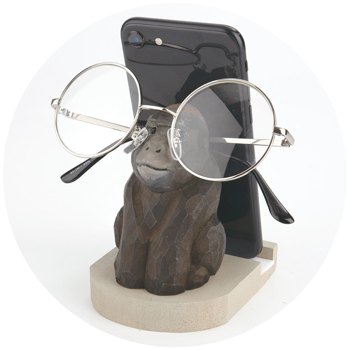 スマホと眼鏡をしっかり支える、やさしい表情の木彫りアニマルたち
