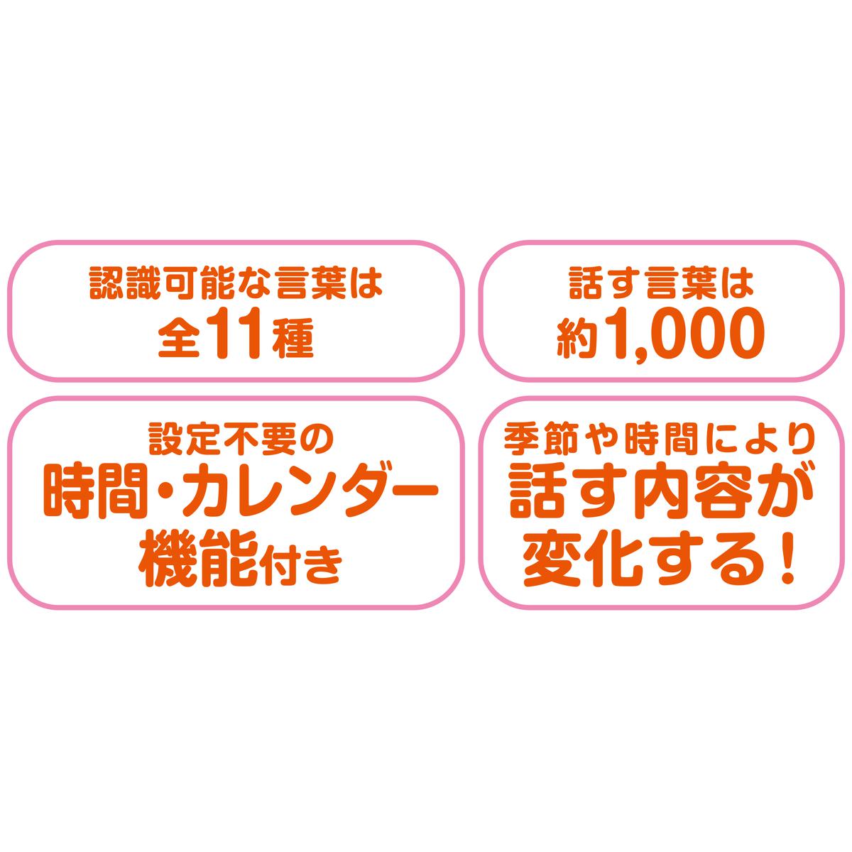 認識可能な言葉は全11種 話す言葉は約1,000 設定不要の時間・カレンダー機能付き 季節や時間により話す内容が変化する!