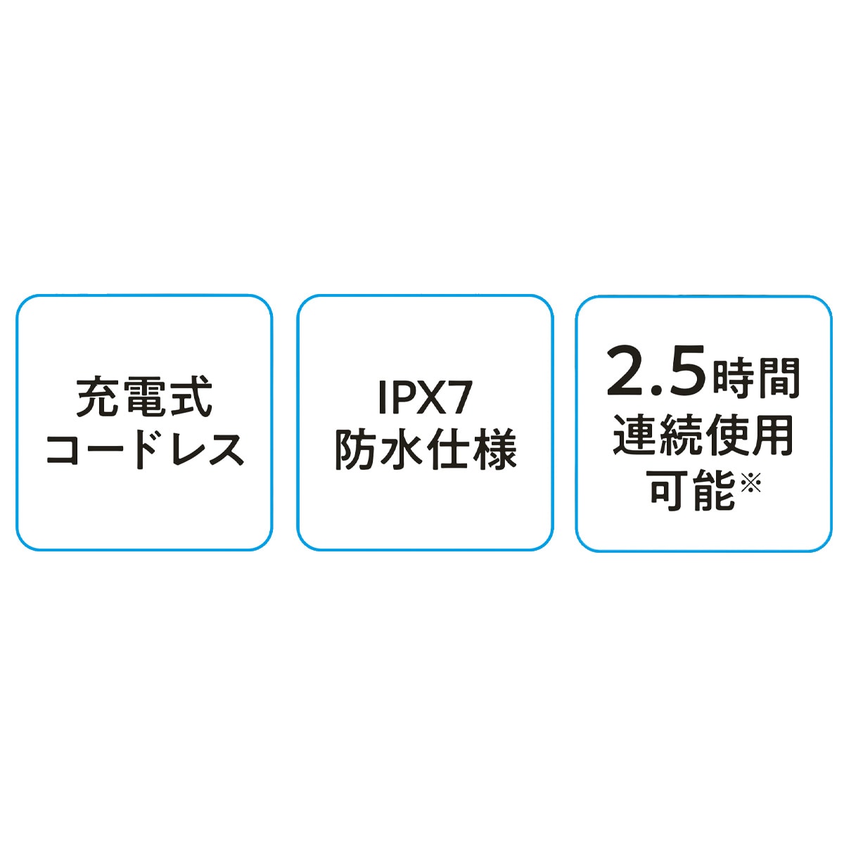 ■サイズ(約cm)/24.5×18.5×6 ■電池容量/1500mAh ■回転力/回転2段階(弱/強) ■防水性能/IPX7 ■充電時間/約2.5時間 ■連続使用時間/[強]約2時間30分 [弱]約2時間50分 ■セット内容/交換ヘッド(ロングブラシ・ブラシ・ハードスポンジ・ソフトスポンジ)、USB充電ケーブル ※コンセントに接続するには別売のACアダプタが必要です。 [航空便不可]●中国製【保証書付1年間】(本体のみ)【交換・返品不可】※商品の特性上、交換・返品はお受けできません