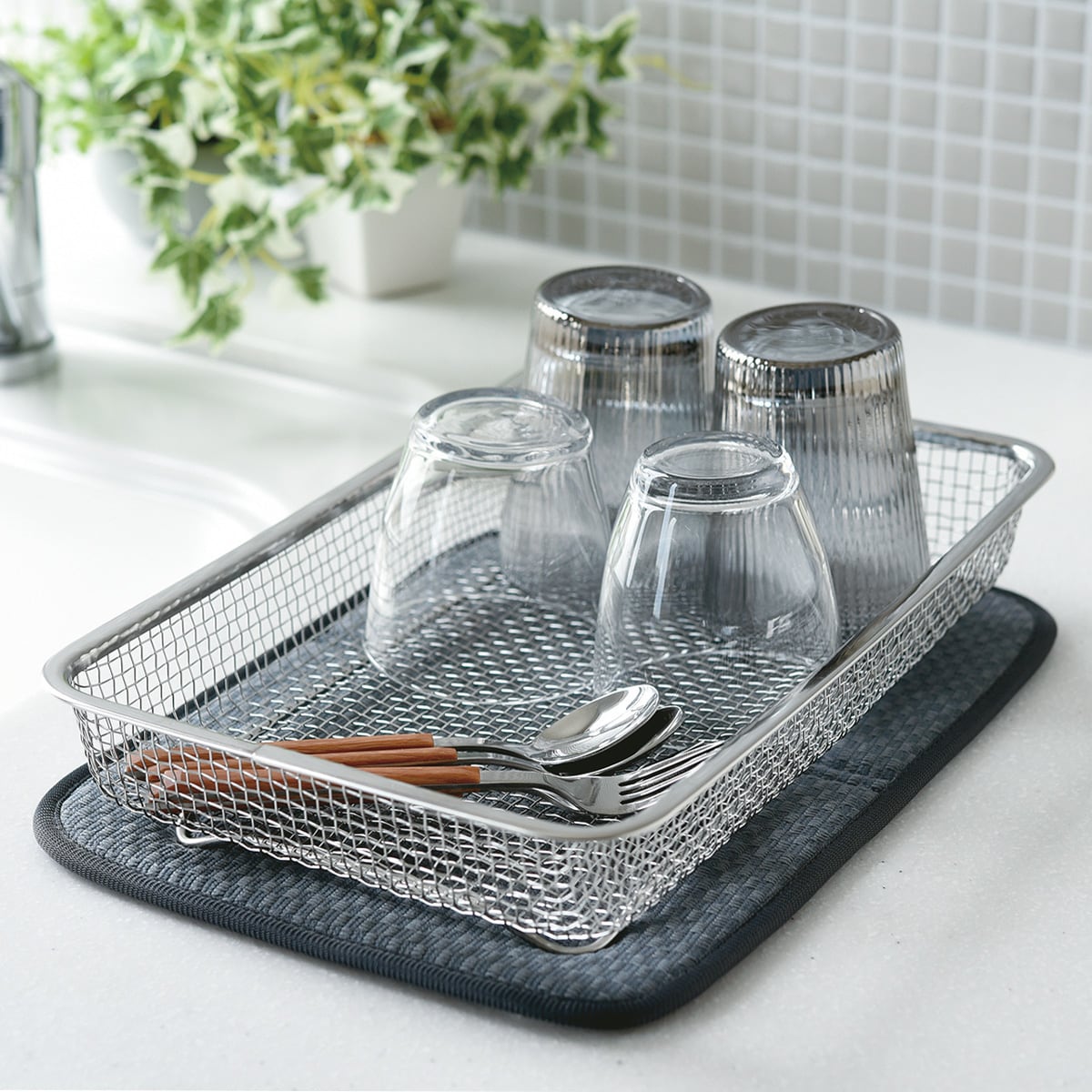 ■[カゴ]ステンレス鋼[マット]表生地:ポリエステル、芯材:ポリウレタン■サイズ(約cm)/[カゴ]幅31.5×奥行20.5×高さ6[マット]幅32×奥行22×高さ0.5●食洗機対応●洗濯機OK(マットのみ)●日本製(マット:中国製)