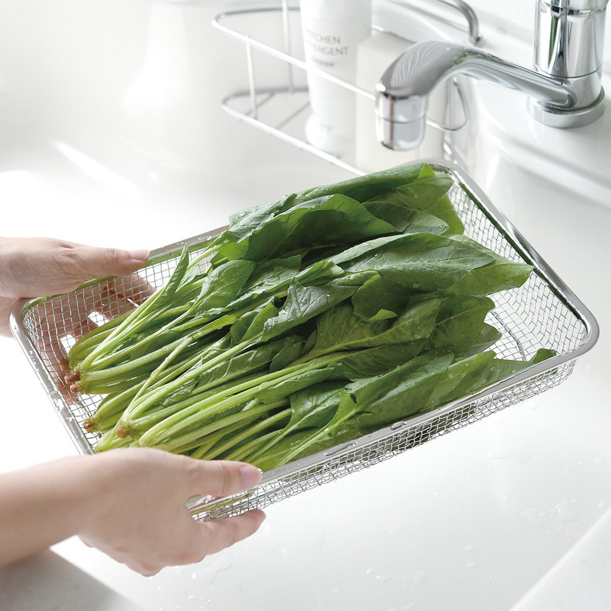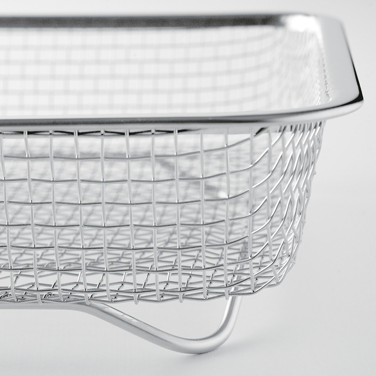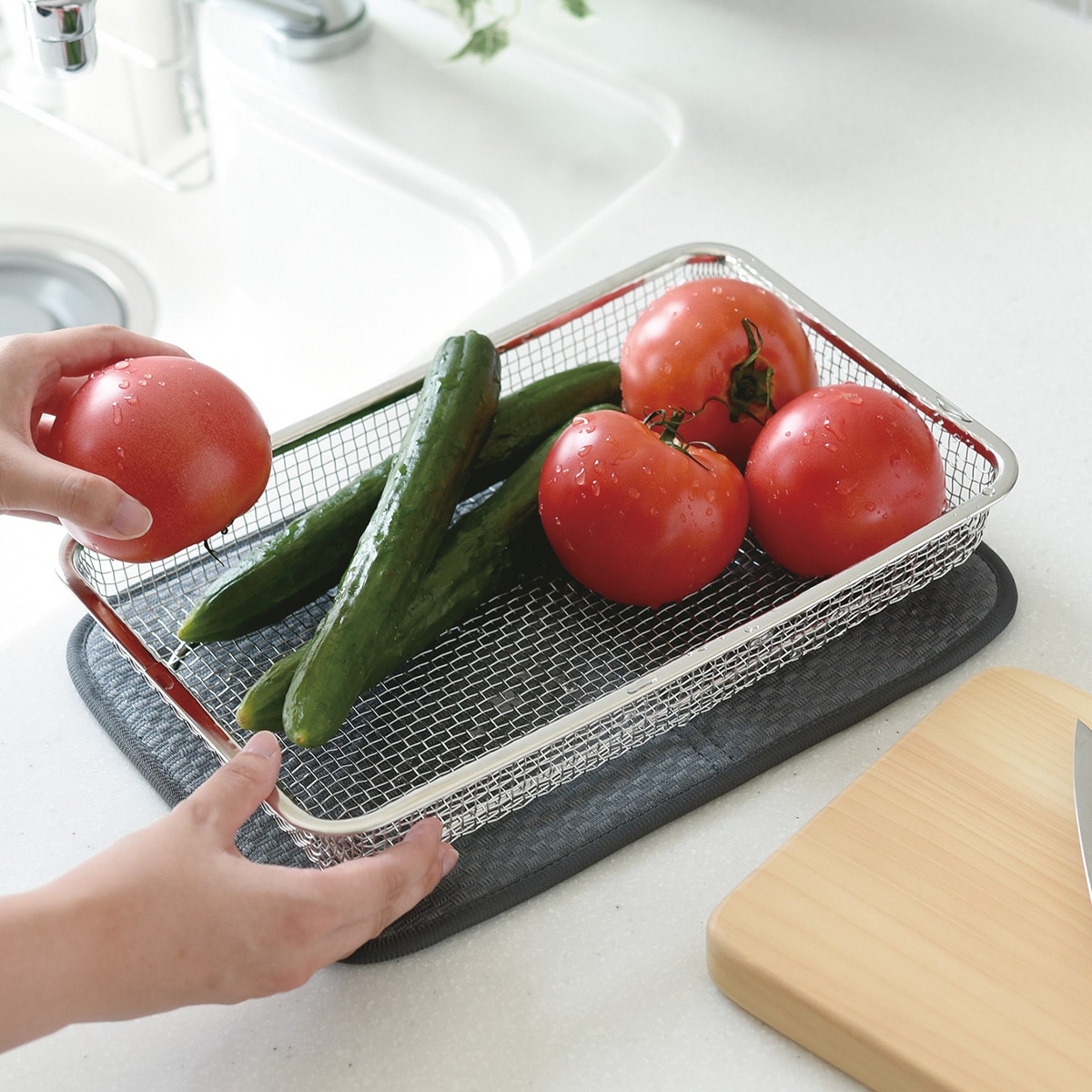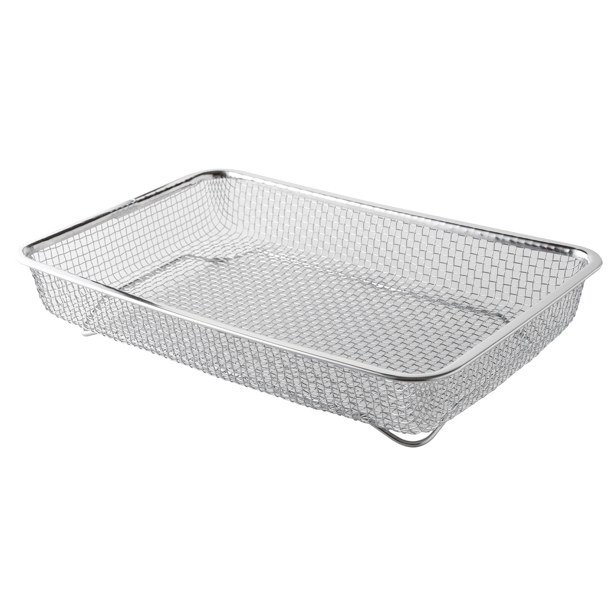 必要な時にサッと取り出して手軽に使える、薄くてコンパクトなステンレス製水切りカゴ。薄型の水切りカゴなので引出しに入れたり、隙間に立てて収納したり、場所を取りません。脚付きの水切りカゴで通気性が良く衛生的。網の目が細かいのでカトラリーやお箸、お弁当グッズなど、小さなものも水切りカゴの網から落ちたりせずにしっかり置けます。食器類だけでなく野菜や果物の水切りザルとしても使えます。