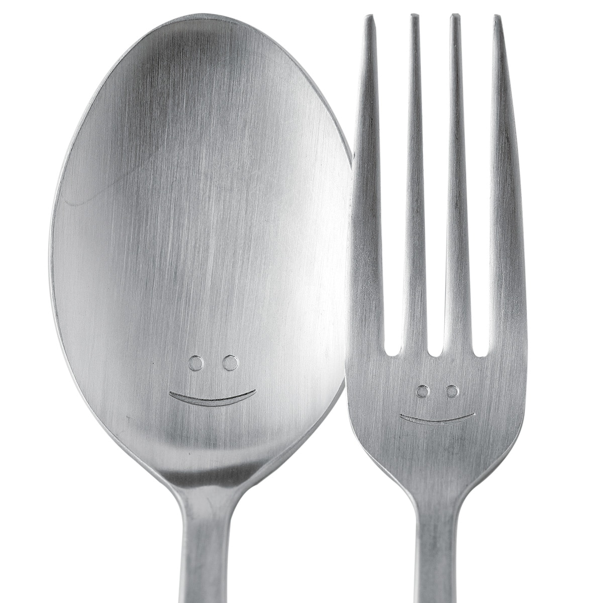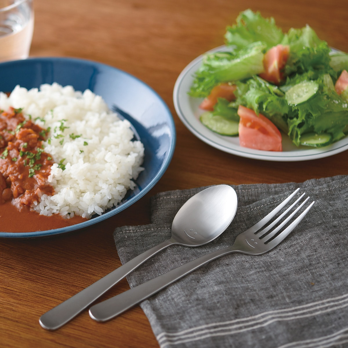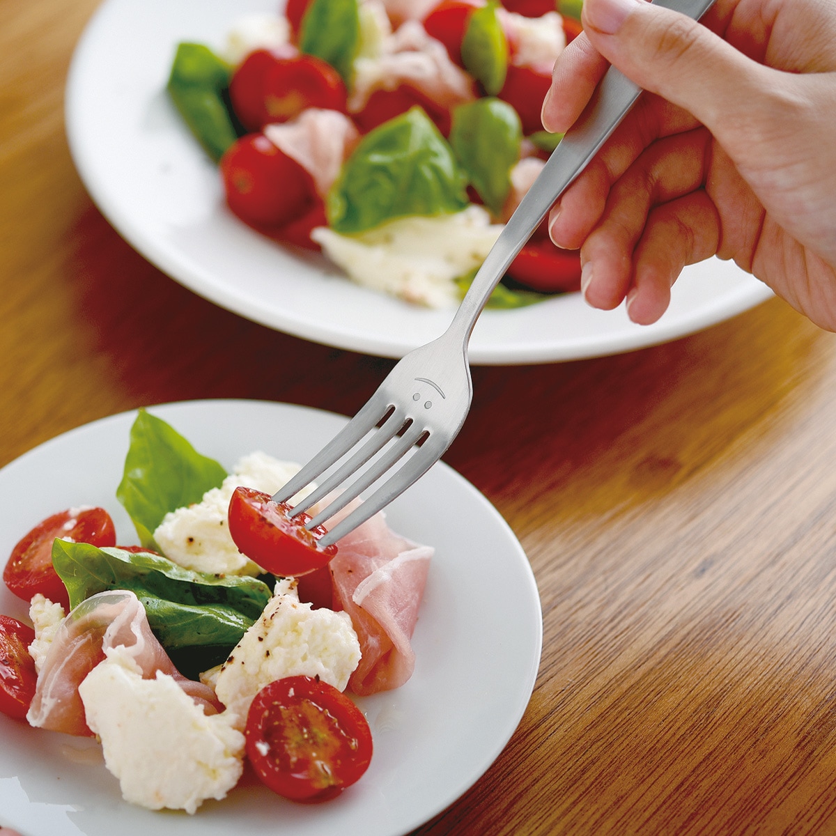 毎日暮らしに笑顔があふれる食事の時間を楽しくするカトラリー♪スプーンとフォークのツボ部分にさりげなく笑顔の刻印を施しています。程よい太さのハンドルは、全体の重量バランスも良く機能的で持ちやすいです。〇金属製品の産地燕三条製〇錆びにくいステンレス製で食洗機にも使用可能〇表面の艶消し加工により上品な光沢がありながらも、キズが目立ちにくい