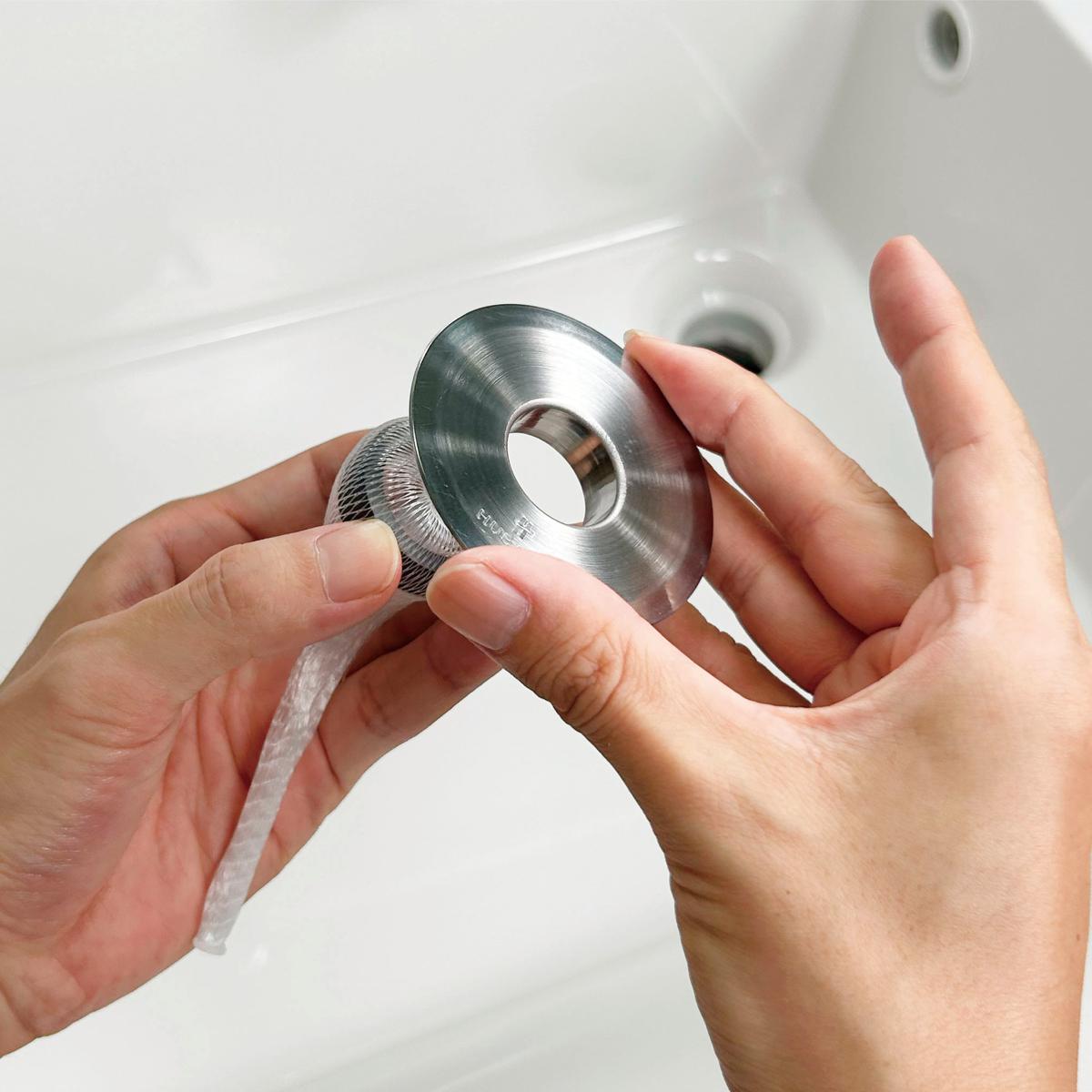 ゴミに触れずにネットごと捨てるだけ。お手入れもサッと拭くだけで簡単掃除!ご家庭の備え付けの排水栓をこの洗面台用ヘアキャッチャ―に取り換えるだけのカンタン設置でゴミ捨て回数が減り、ストレスフリー!な排水口に激変。