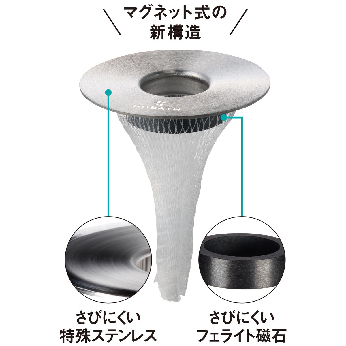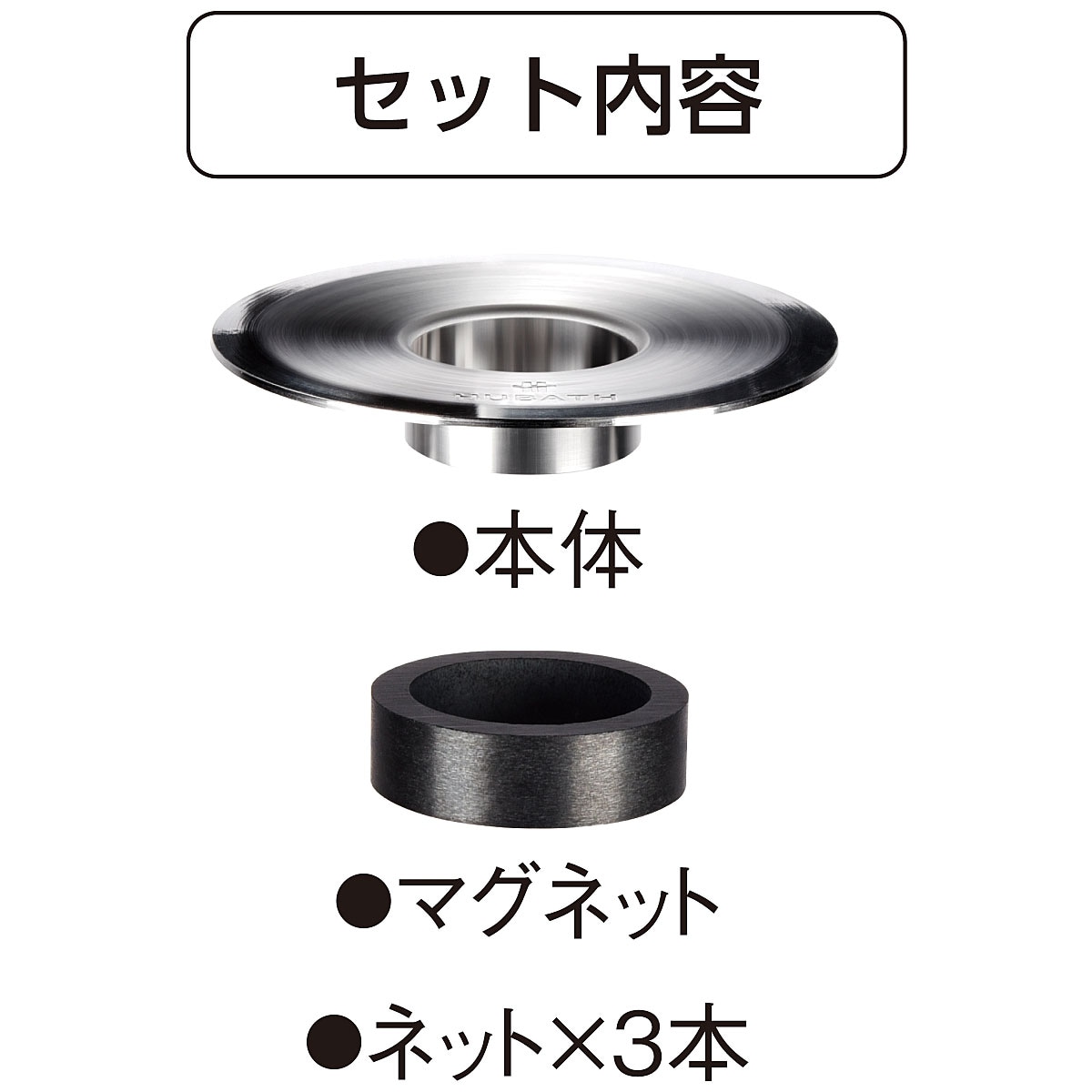 ■[金属部]ステンレス [マグネット部]フェライト磁石 [ネット]ポリエチレン ■[サイズ(約cm)]本体/直径6.4×高さ1.2 ネット/長さ17 ■重量/約45g ●耐熱温度/約70℃ ●付属品/排水口用ゴミ取りネット3本 ●設置可能サイズ/排水口の口径36~45mm ▼設置できない排水口タイプ/排水口36mm以下あるいは45mm以上のタイプ、排水口から3cmほど下に十字のゴミ受けがあるタイプ、ポップアップ式で止水栓が取り出せないタイプ ※上記に限らず、設置した際に排水口ネットが干渉する排水口は使用に適しませんのでご注意ください。※排水口ネット単品の購入につきましては、ホームセンターや100円ショップ等のお風呂の排水口ネットコーナーで販売されていることが多いです。また取扱説明書記載のメーカー公式オンラインショップからも購入可能です。●日本製