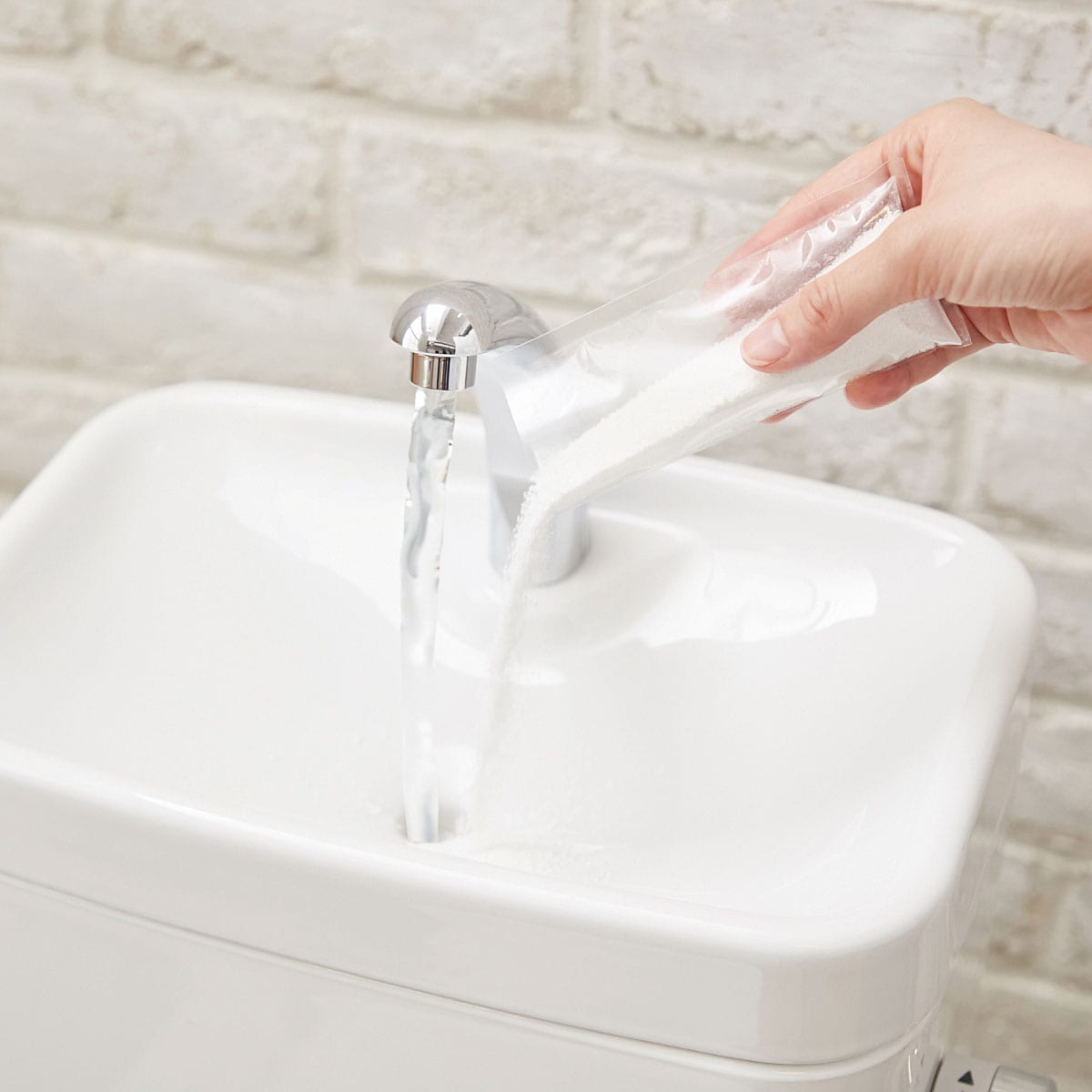 一度排水し、トイレタンクの手洗い用排水口から吸水中に本剤1包を入れてください。