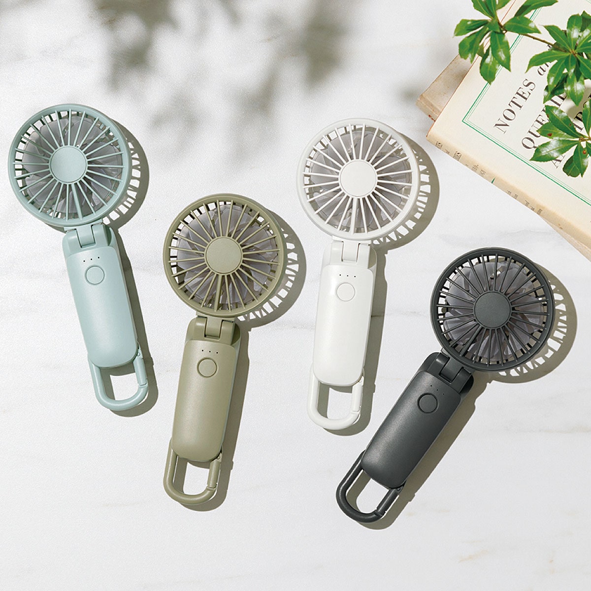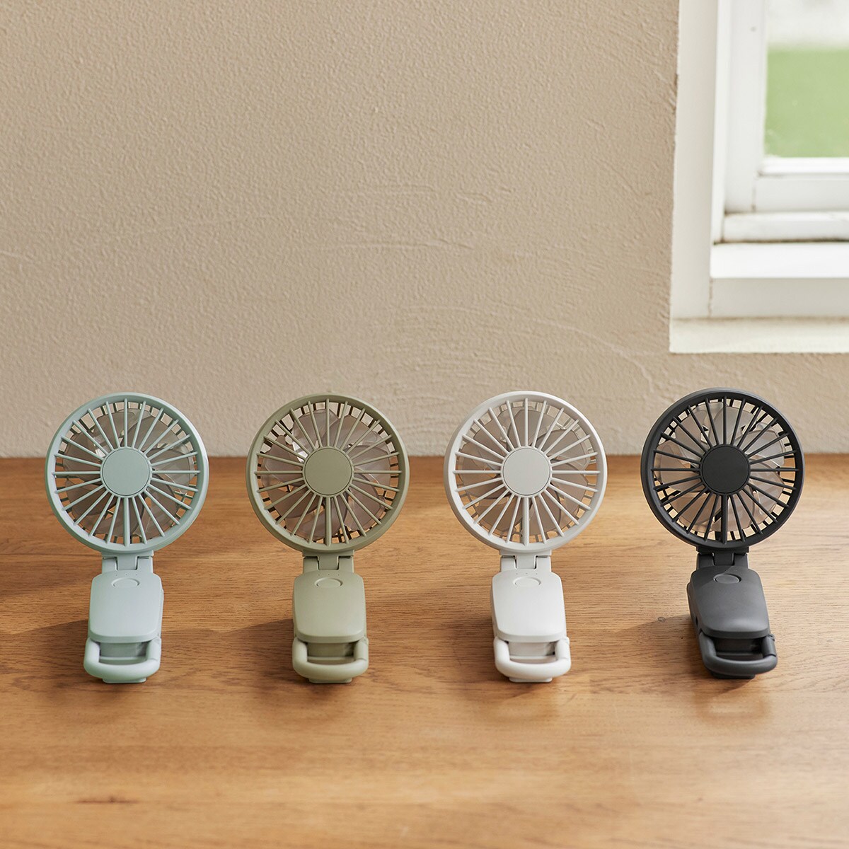 (左から) ライトブルー・グリーン・ライトグレー・ダークグレーコンパクトなのに大風量! リズムハンディファンです。