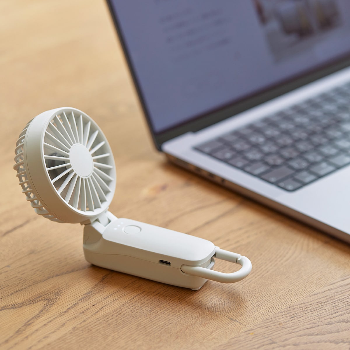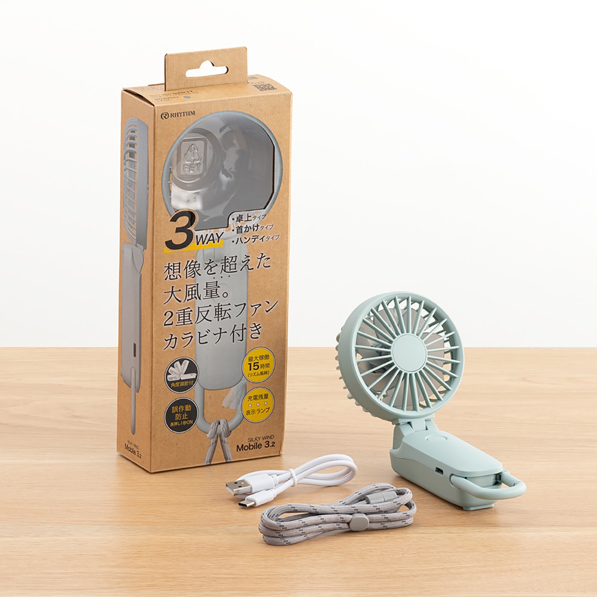 ハンディ・ハンズフリー・デスクで使える大風量の3WAYファン。ボタン長押しで電源が入る、誤作動防止機能付きです。☆改良POINT・「リズム風」モードが追加されました。・連続使用時間が最大「15時間」に伸びました。