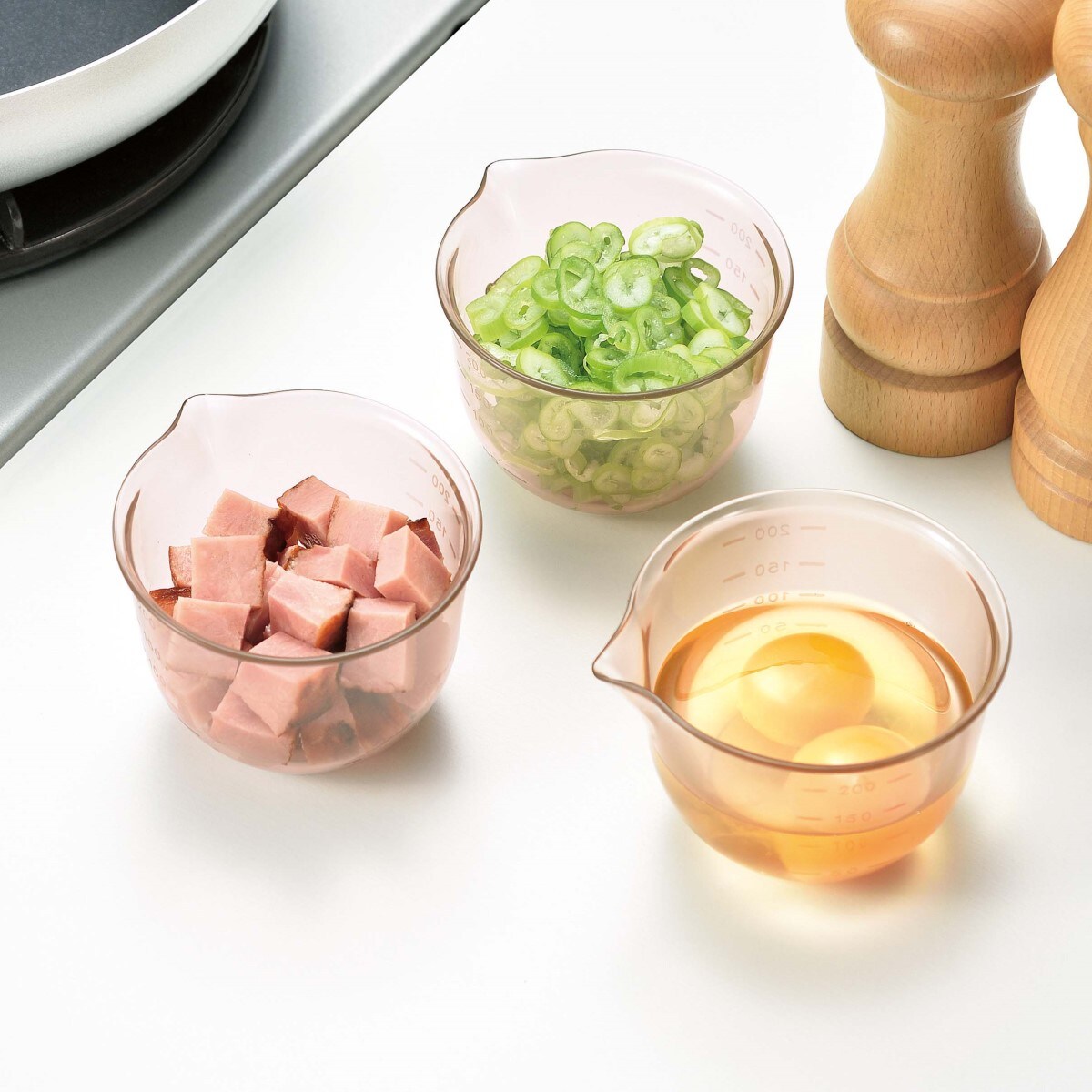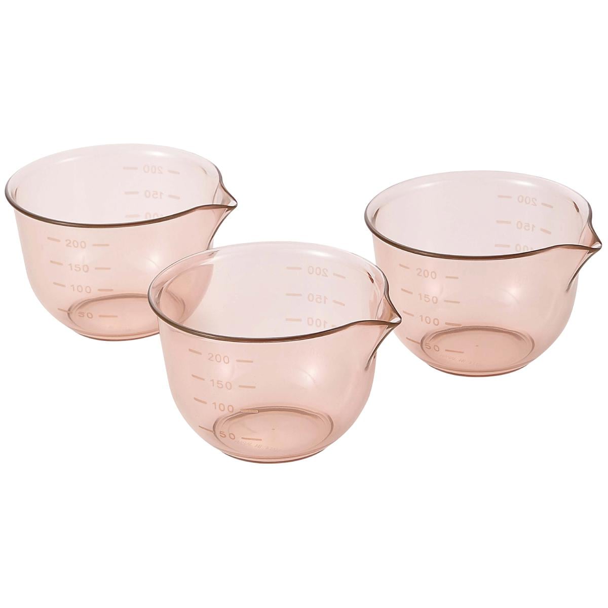 透明で分量も見やすく、ガラスのようで落としても割れないプラスチック製です♪●目盛り付き軽量に便利な目盛り付きなのでドレッシング作りにも便利にお使いいただけます。注ぎ口も付いているので、ソースを作ったらそのまま料理にかけられます。●電子レンジ使用可能耐熱温度200度で、野菜などの下ごしらえに重宝します。また、バターを溶かしたり、ゼラチンを溶かすための少量のお湯を温めたり、お菓子作りにも便利です。●調理の下準備に便利な嬉しい3個セット便利な3個組で食材や調味料を小分けにして下準備