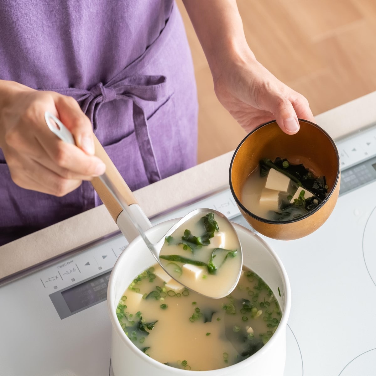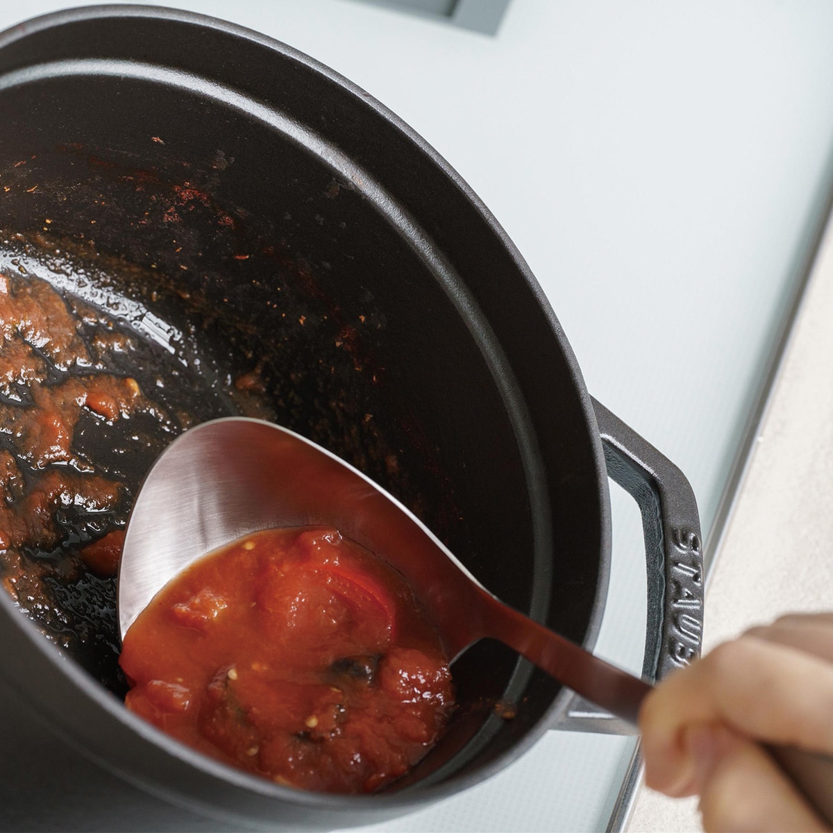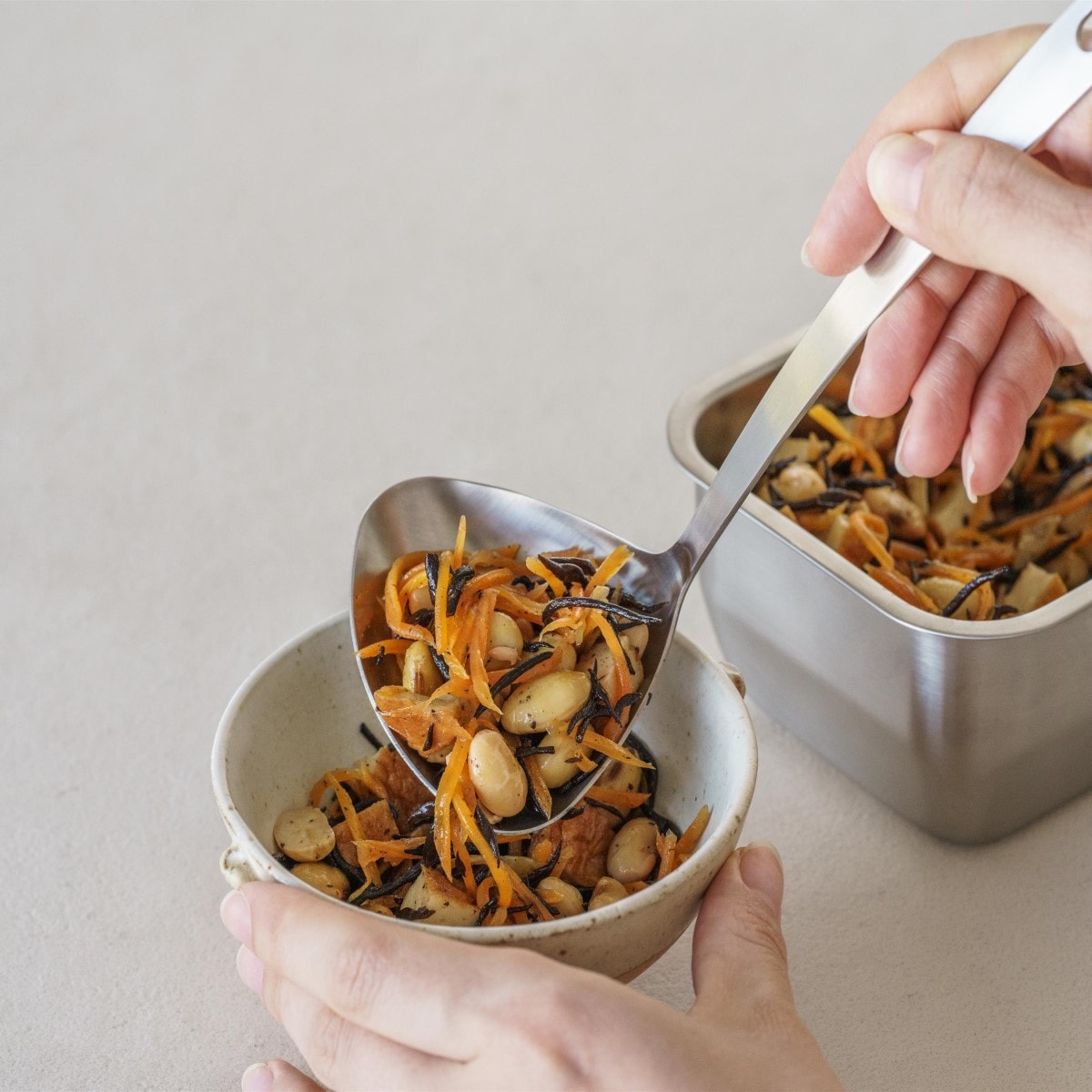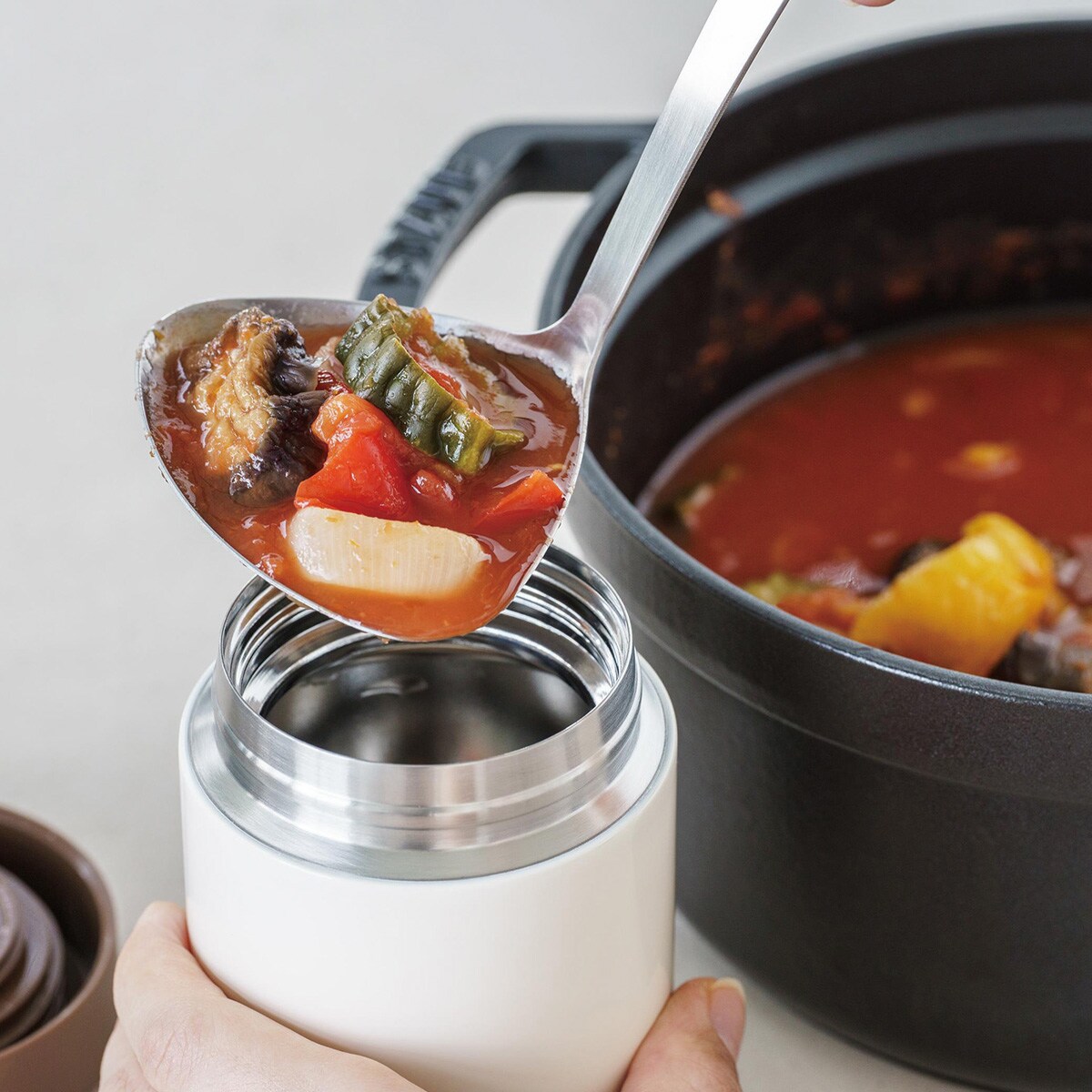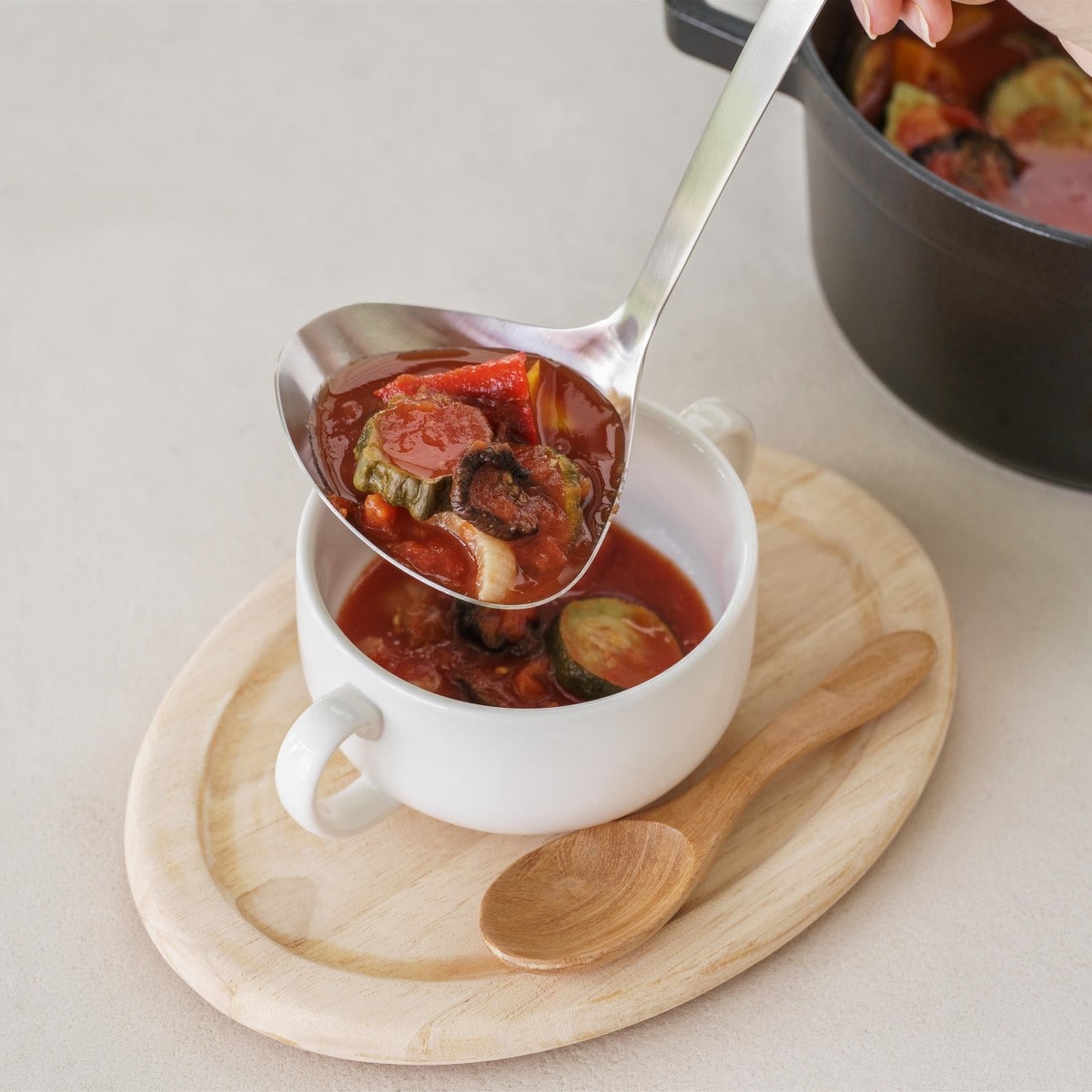 ハンドルのカーブで汁物や具材もすくいやすい。