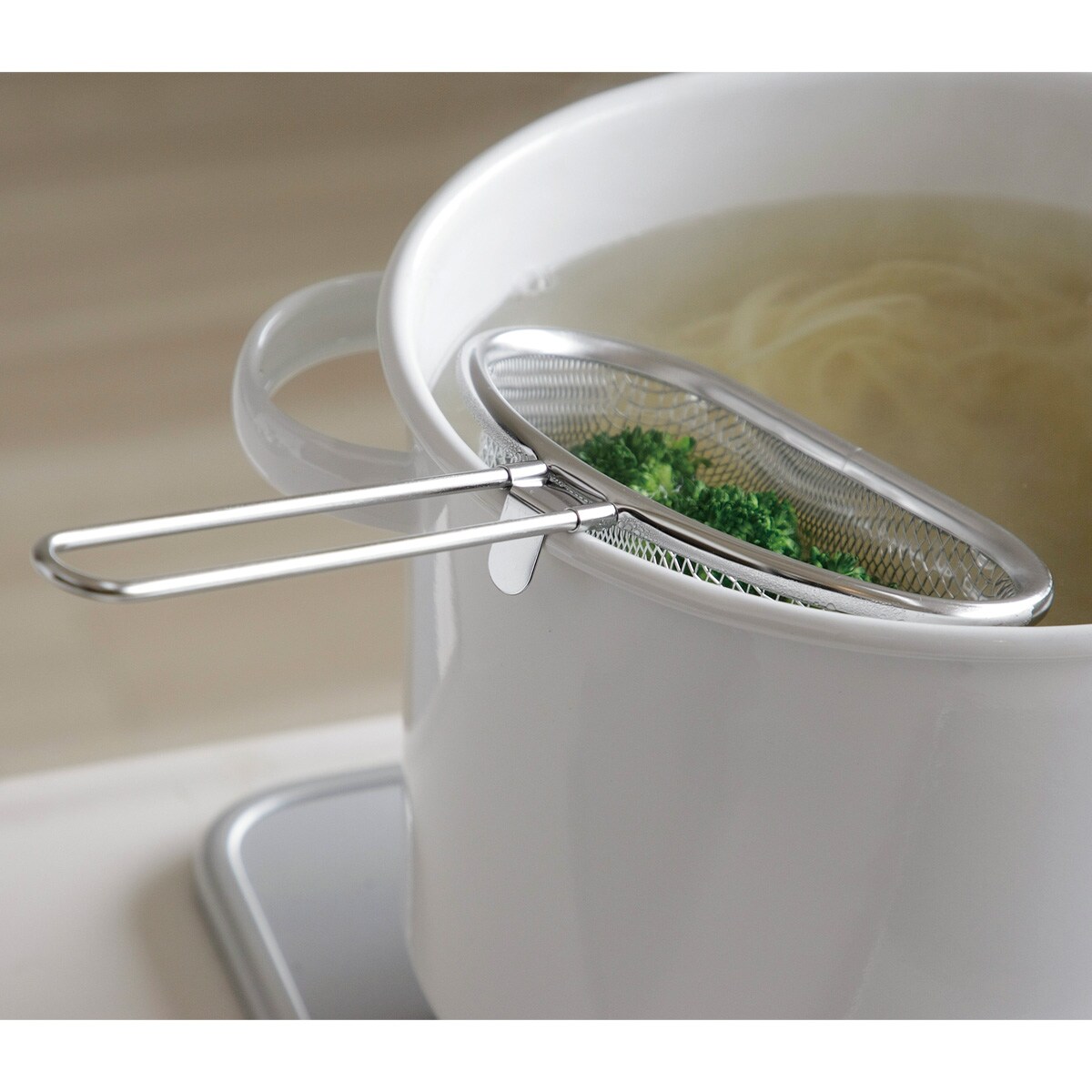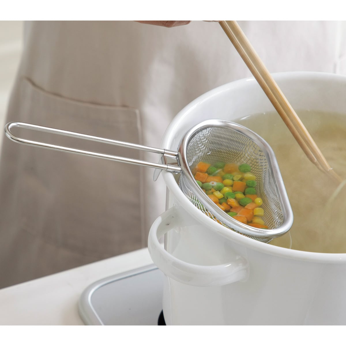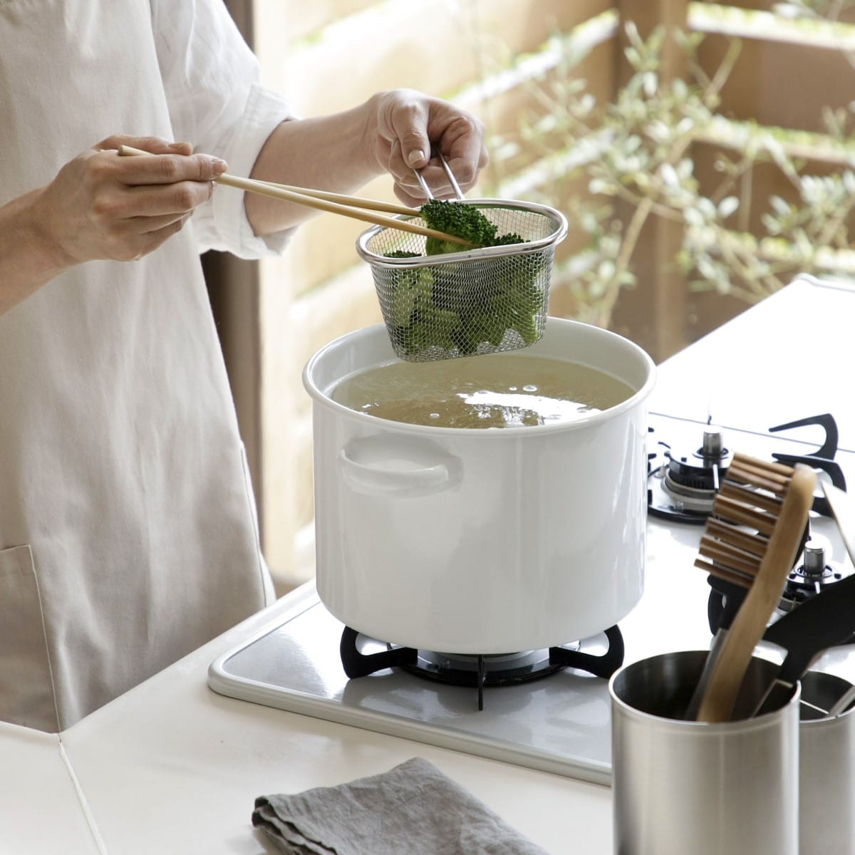異なる2種類の食材を、一つの鍋で一緒に茹でることができます。パスタを茹でながら付け合わせの野菜も調理できます!持ち手に着いたフックのおかげで、手を放してもザルが傾いて中身がこぼれてしまうこともありません。茹でたものも簡単に取り出せます。オールステンレスで臭い移りや色移りしにくい。