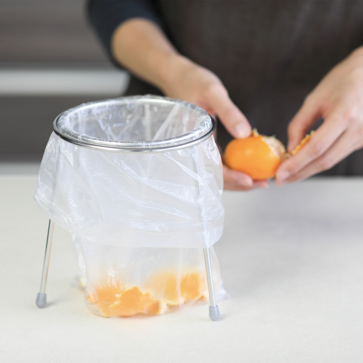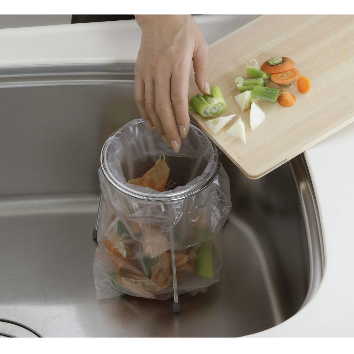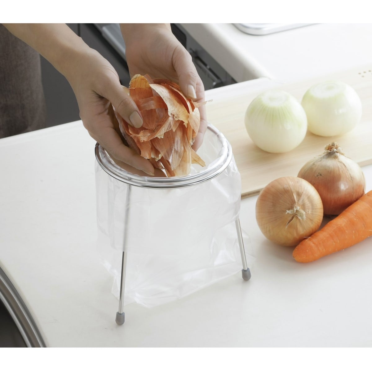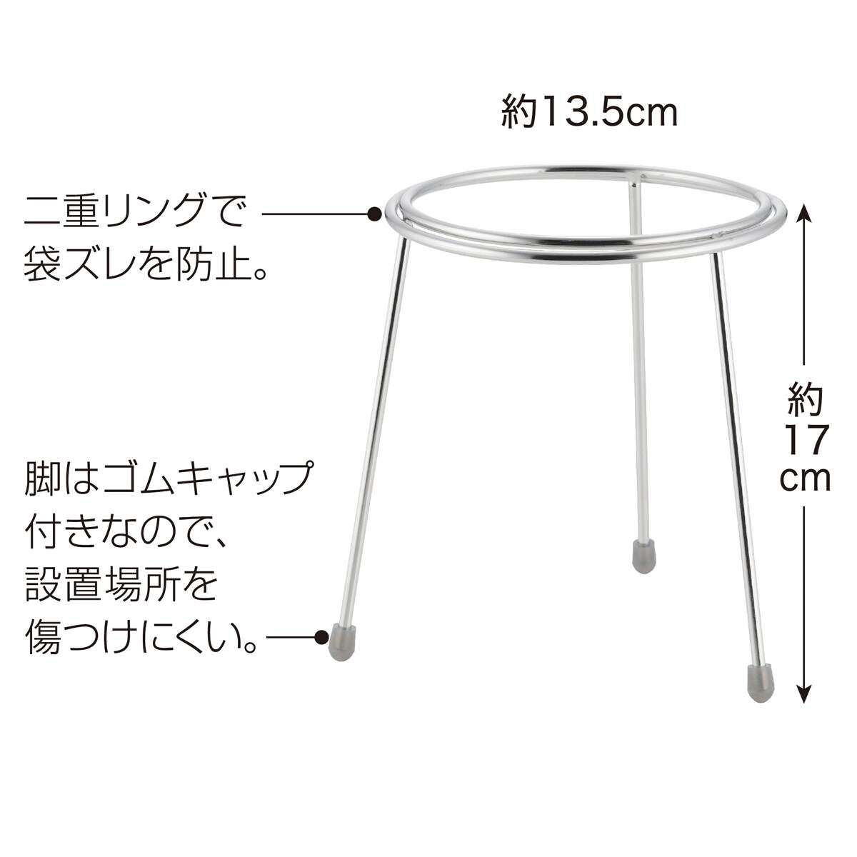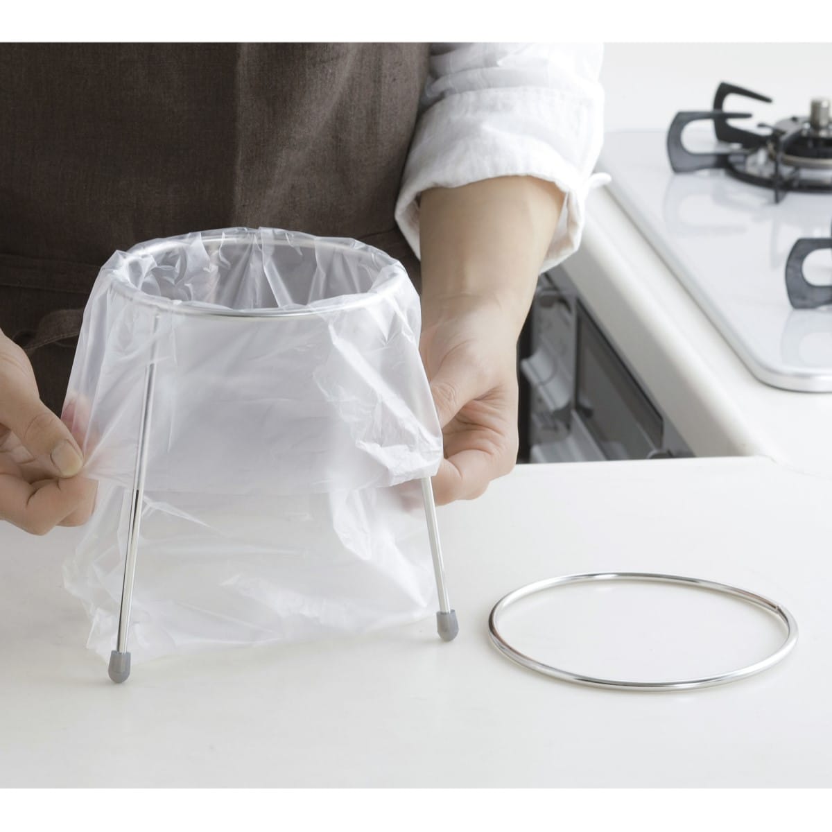 袋を掛けるだけで、作業台や卓上でのゴミ入れとして使うことができます。袋ズレをおさえるリング付き。接地面が少ないので汚れが付きにくく、汚れても洗いやすいステンレス製です。