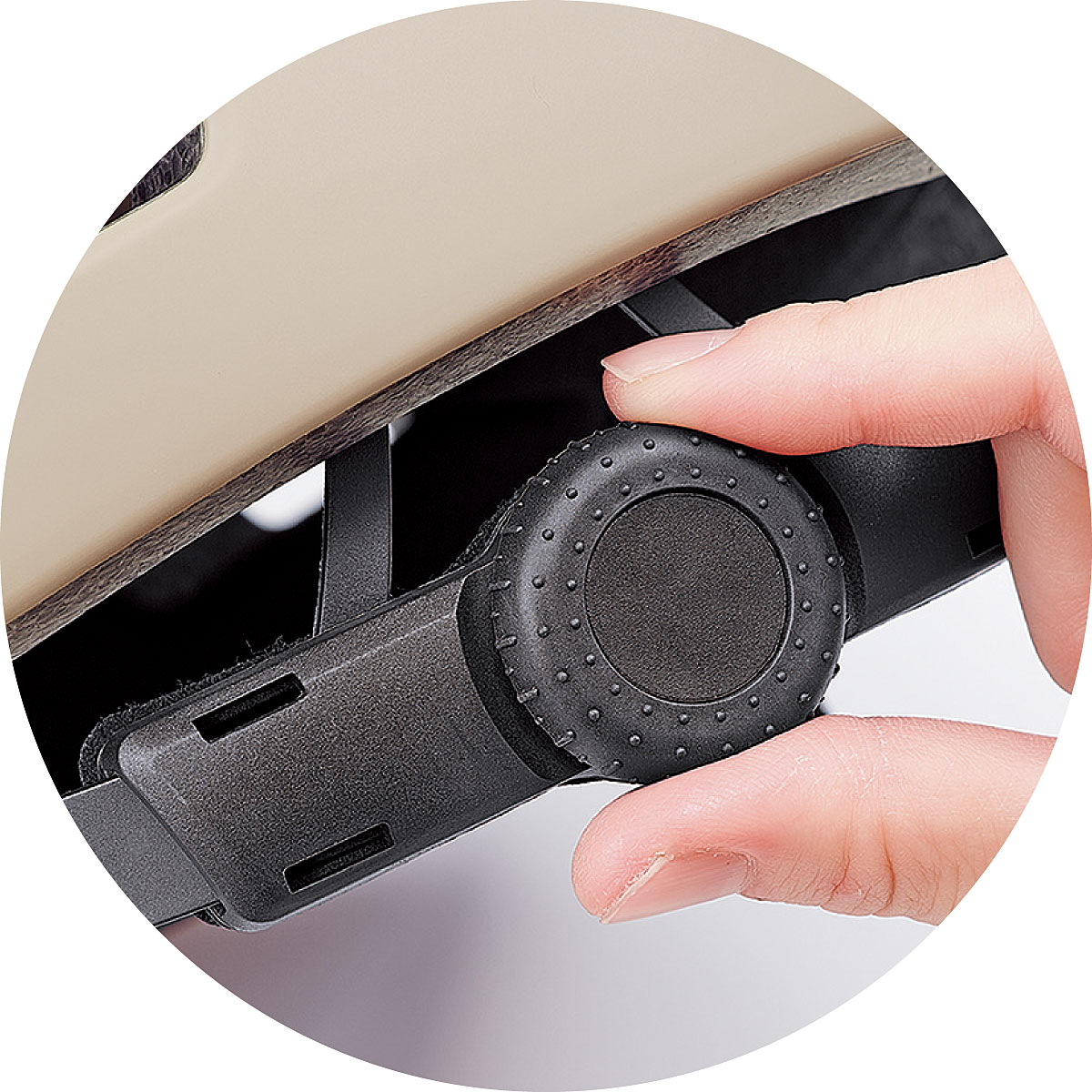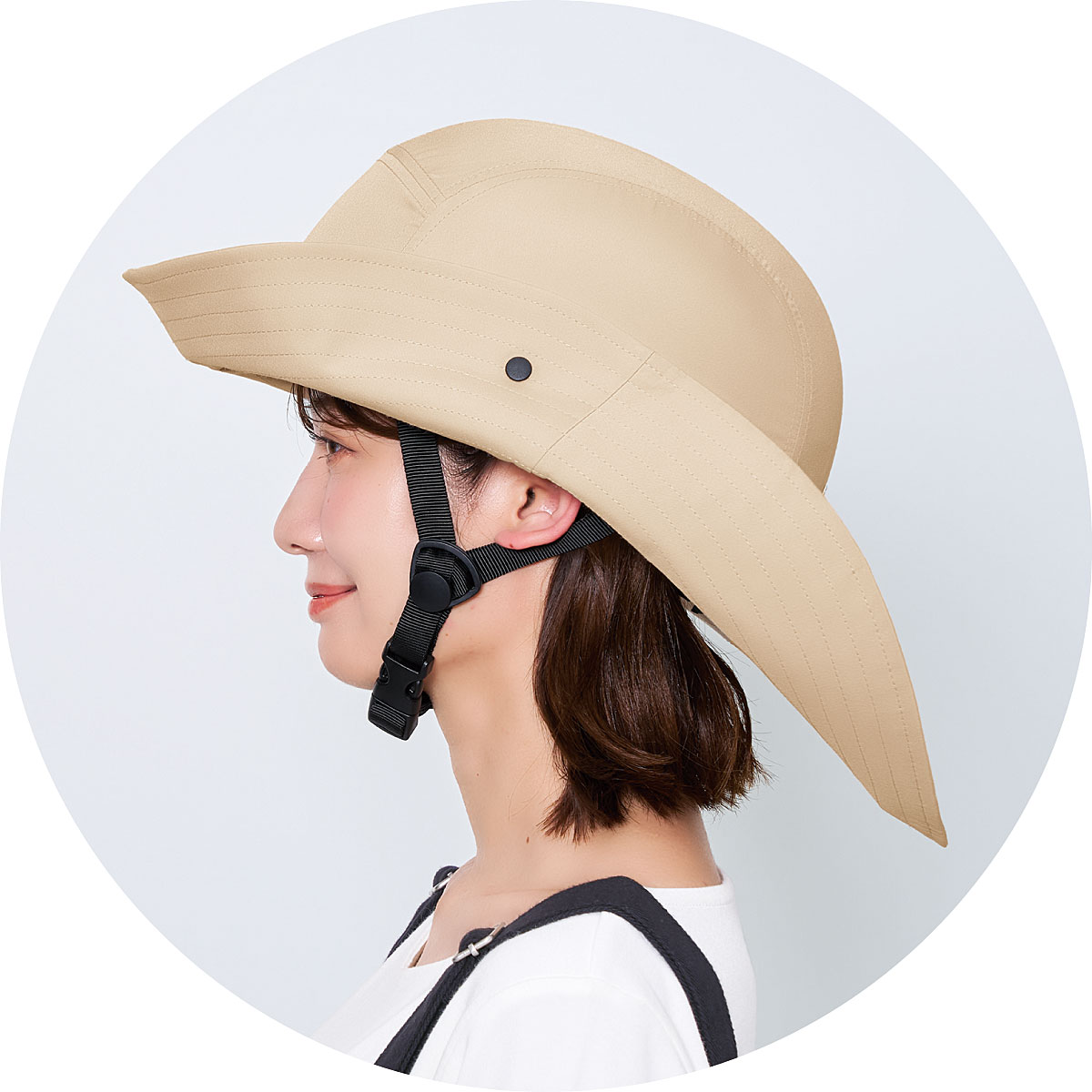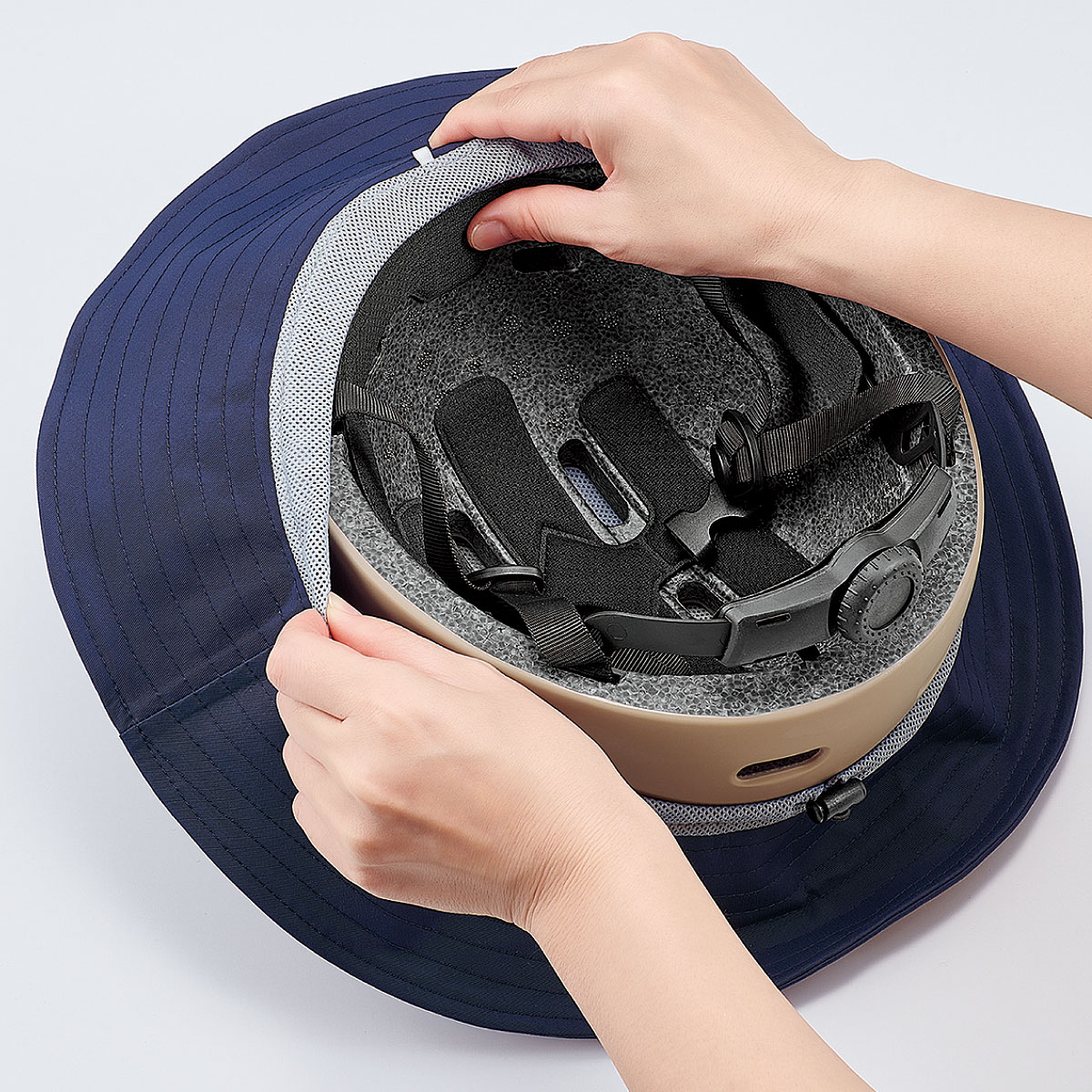服装に合わせて帽子部分を付け替えられる、まるで帽子のようなヘルメット!後ろのツバが大きく、日よけ代わりになるのでしっかり日焼け対策ができます。両サイドについているスナップボタンで形が変えられます。後ろには安心のリフレクター付。