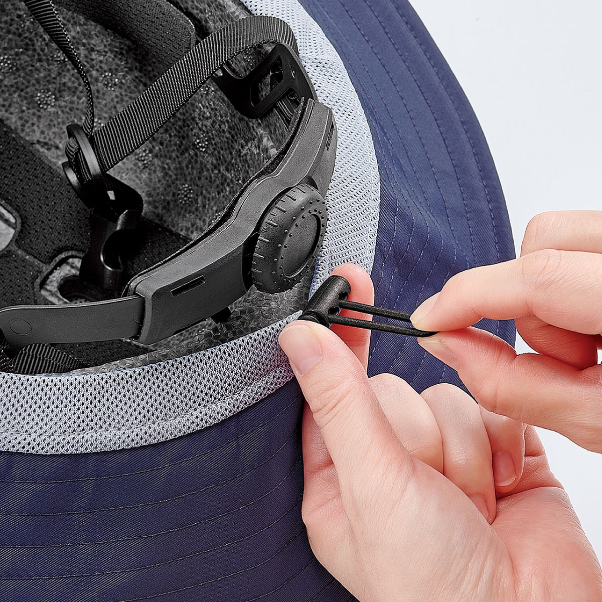 帽子のドローコードを締める ※帽子が飛ばないように正しく装着してください。