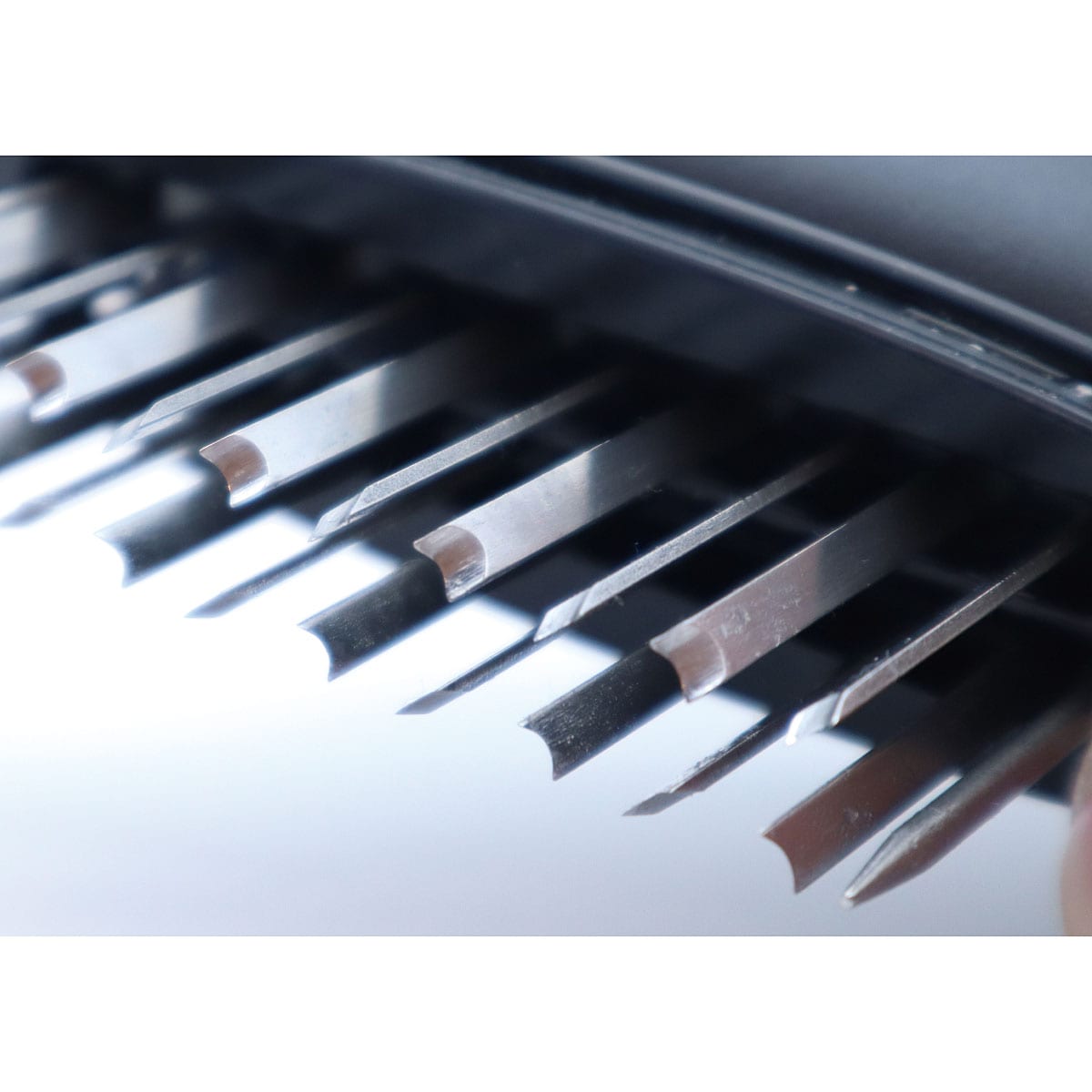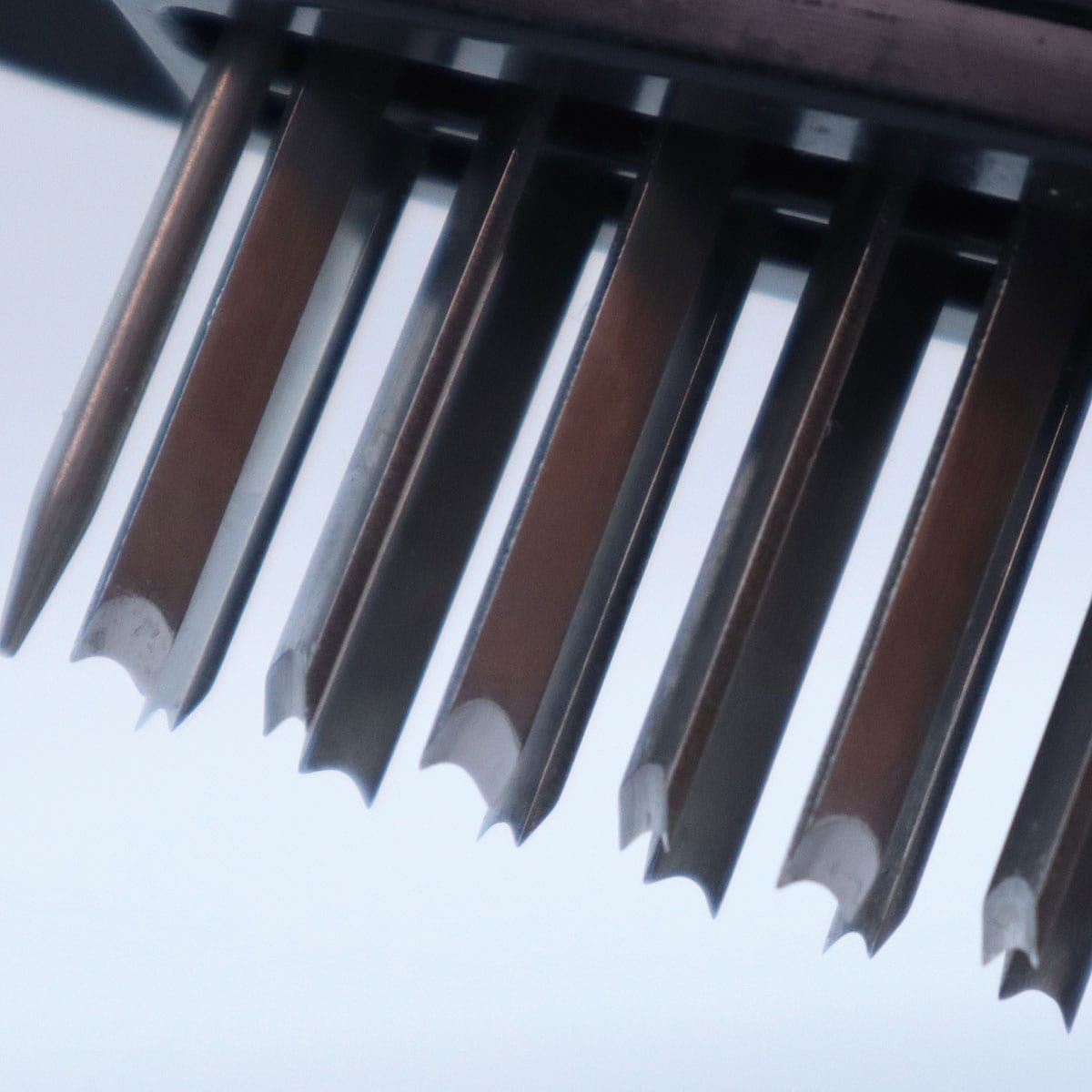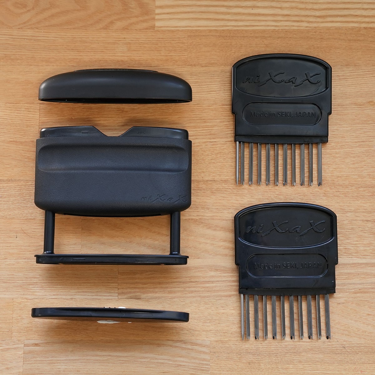 スタンプを押すようにポンポンとお肉にプッシュするだけ。簡単にスジをカットしてやわらかく!岐阜県関市の彫刻刀メーカーの熟練職人が一本一本仕上げた20本の彫刻刀のスジ切り器。U字型の刃が硬いスジも逃さず、X型にスジを切れるように刃を配置しており、横にずらしてプッシュしていくだけで効率的にスジを切ることができます。両端には刃より少し長いピンを設置しているので、刃先がまな板に当たらず、まな板を傷つけにくいです。