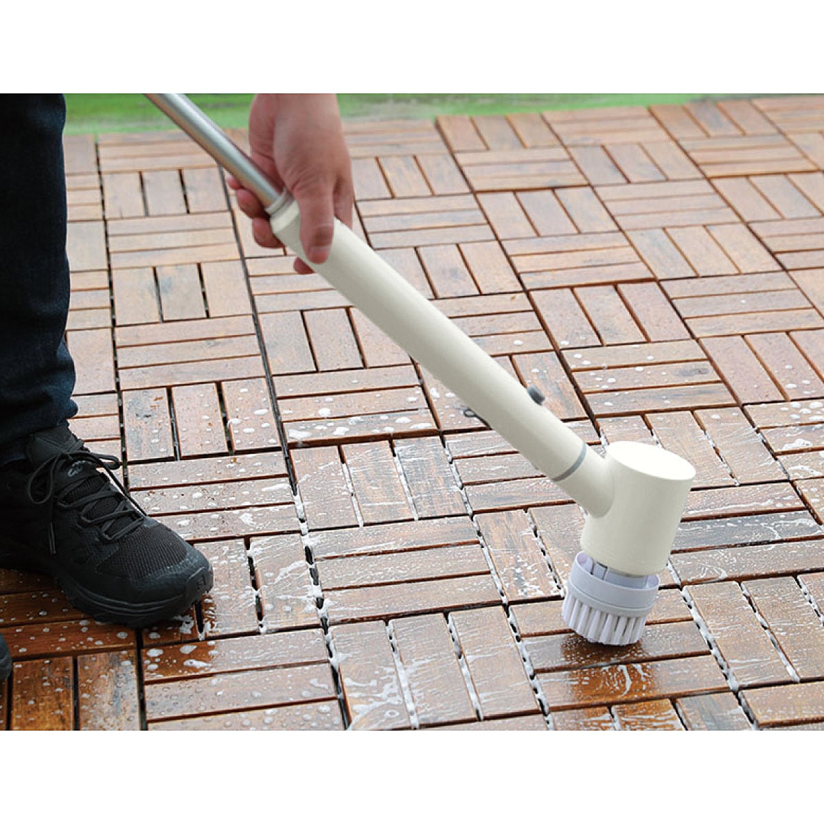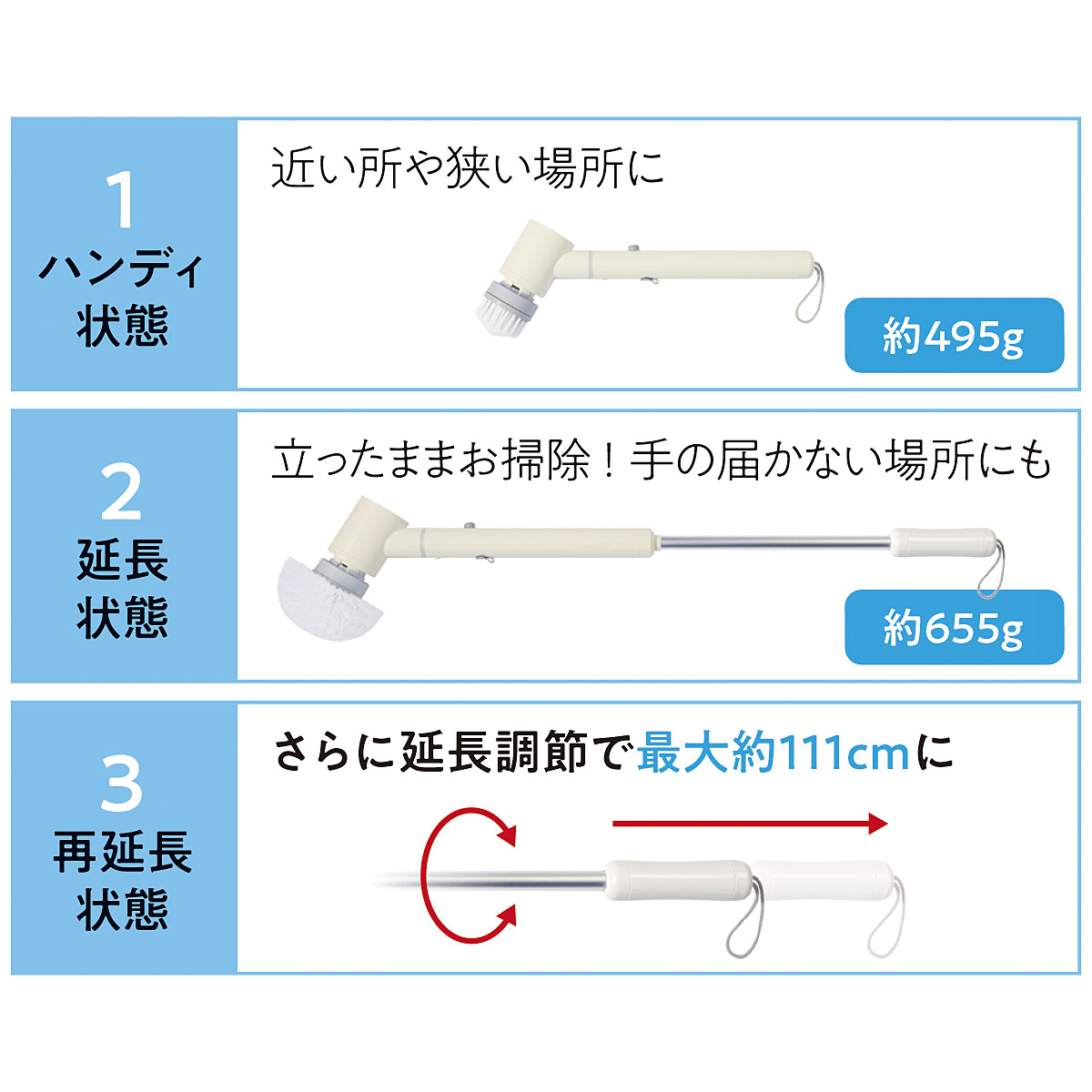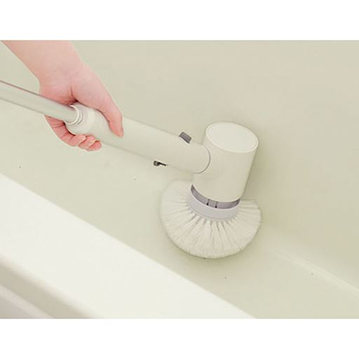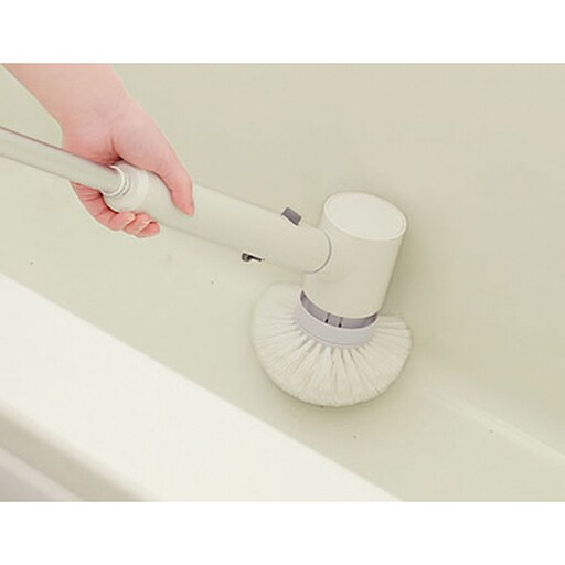 腰をかがめず軽い力で洗えるバスブラシ!ブラシの中心と周囲が双方向に両回転する仕様なので、一方向の回転だけでは落としにくい汚れを洗浄することができます◎左右にブレにくく腕の力が弱い方でも振り回されないので掃除が効率的に!●5種類の付属ブラシで家中丸ごと洗浄! お風呂場・洗面台・浴室壁面・排水口・窓ガラス・網戸・シンク・玄関などの掃除に。●3段階の長さ調節 ・ハンディ状態・延長状態・再延長状態●充電式なので電源のない場所でも手軽に掃除可能。