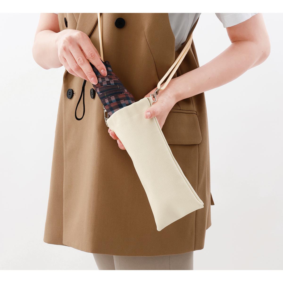 傘の持ち運びに便利な収納袋!長傘、折りたたみ傘の両方使える2WAY仕様!荷物の多いときや混雑した電車内、スーパーに傘袋がない時など、濡れた傘のお困りに。ストラップ付きなので肩から下げれば両手が自由に使えます。袋は自動で収縮してスムーズに本体に収まります。袋の先端部分のボタンを外すと、溜まった水も簡単に抜けます。