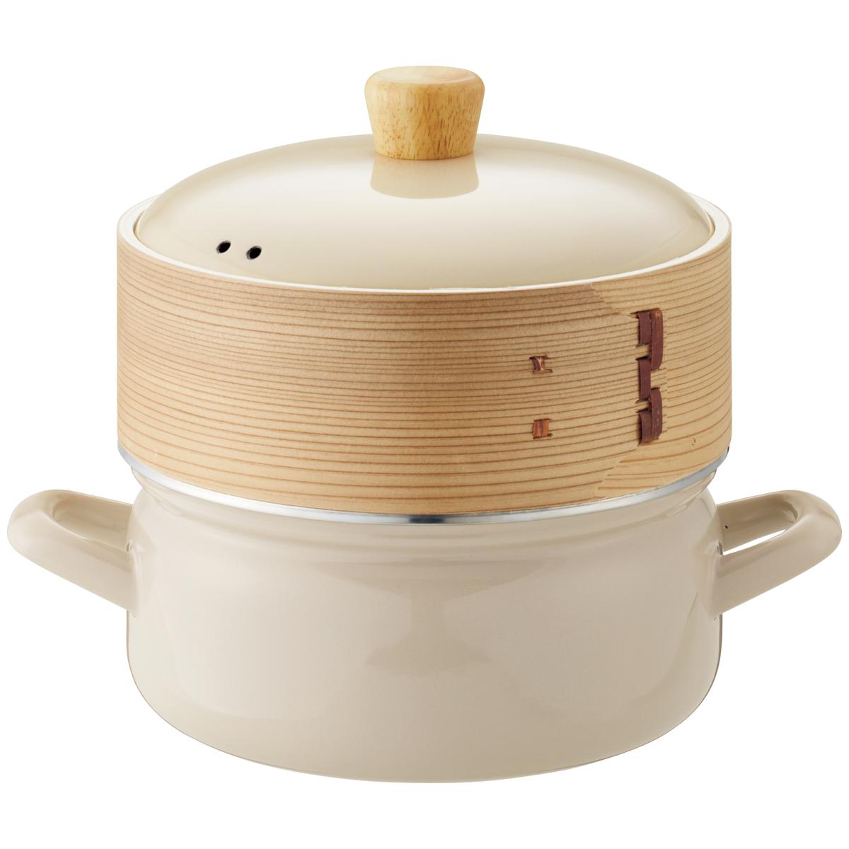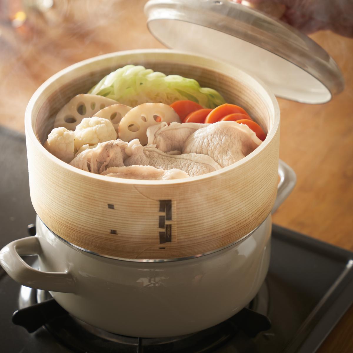 せいろによって、蒸気で加熱することにより、食材本来の味が際立ちます。素材の天然木と竹が調理中の余分な水気を適度に吸収し、蒸気が食材をやさしく包み込むように、ふんわりと蒸し上げます。肉まんやシュウマイなどの冷凍食品は蒸気のおかげでふっくらつやつやの仕上がりに。いつもと一味違う冷凍食品を楽しめます。食材を詰めて鍋にかけたら、あとは手間をかけずに、ヘルシーな蒸し料理の完成です。ホーロー鍋は煮る・揚げるといったお料理にも活用していただけます。