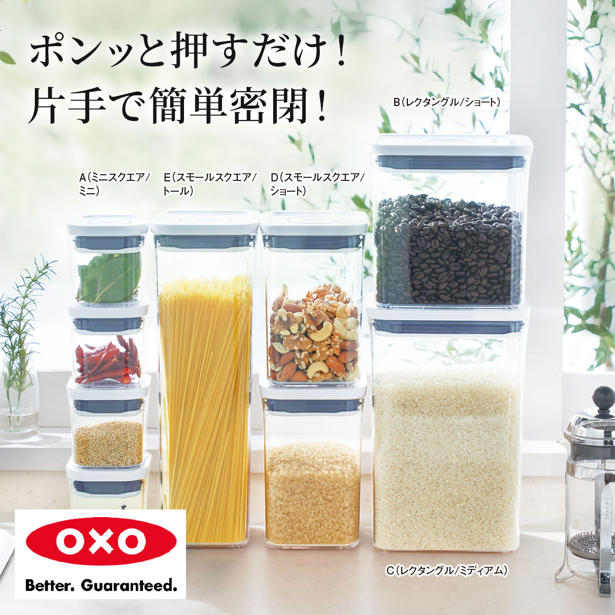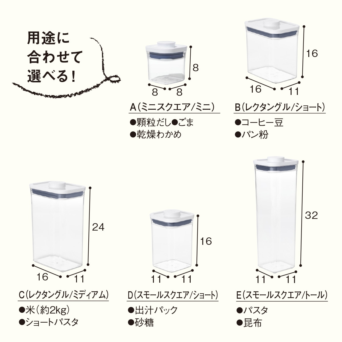 (左から)A(ミニスクエア/ミニ)、E(スモールスクエア/トール)、D(スモールスクエア/ショート)、B(レクタングル/ショート)、C(レクタングル/ミディアム) ポンッと押すだけ!片手で簡単密閉!