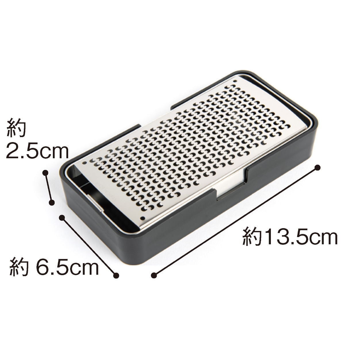 ■[金属部]18-8ステンレス [受皿]ABS樹脂 ■サイズ(約cm)/幅13.5×奥行6.5×高さ2.5 ■重量/約96g(おろし金52・受け皿44) ●耐熱温度/90℃●食洗機不可●日本製